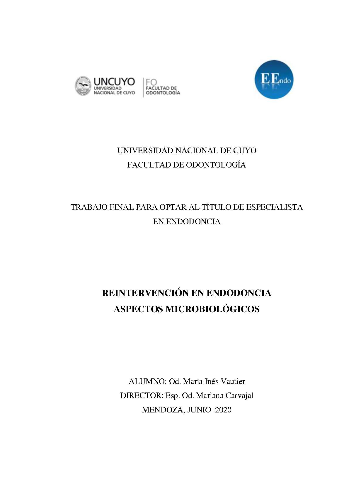 Vautier, María Inés. (2020). Reintervención en endodoncia : aspectos microbiológicos (Trabajo final de especialización). Mendoza, Universidad Nacional de Cuyo. Facultad de Odontología .