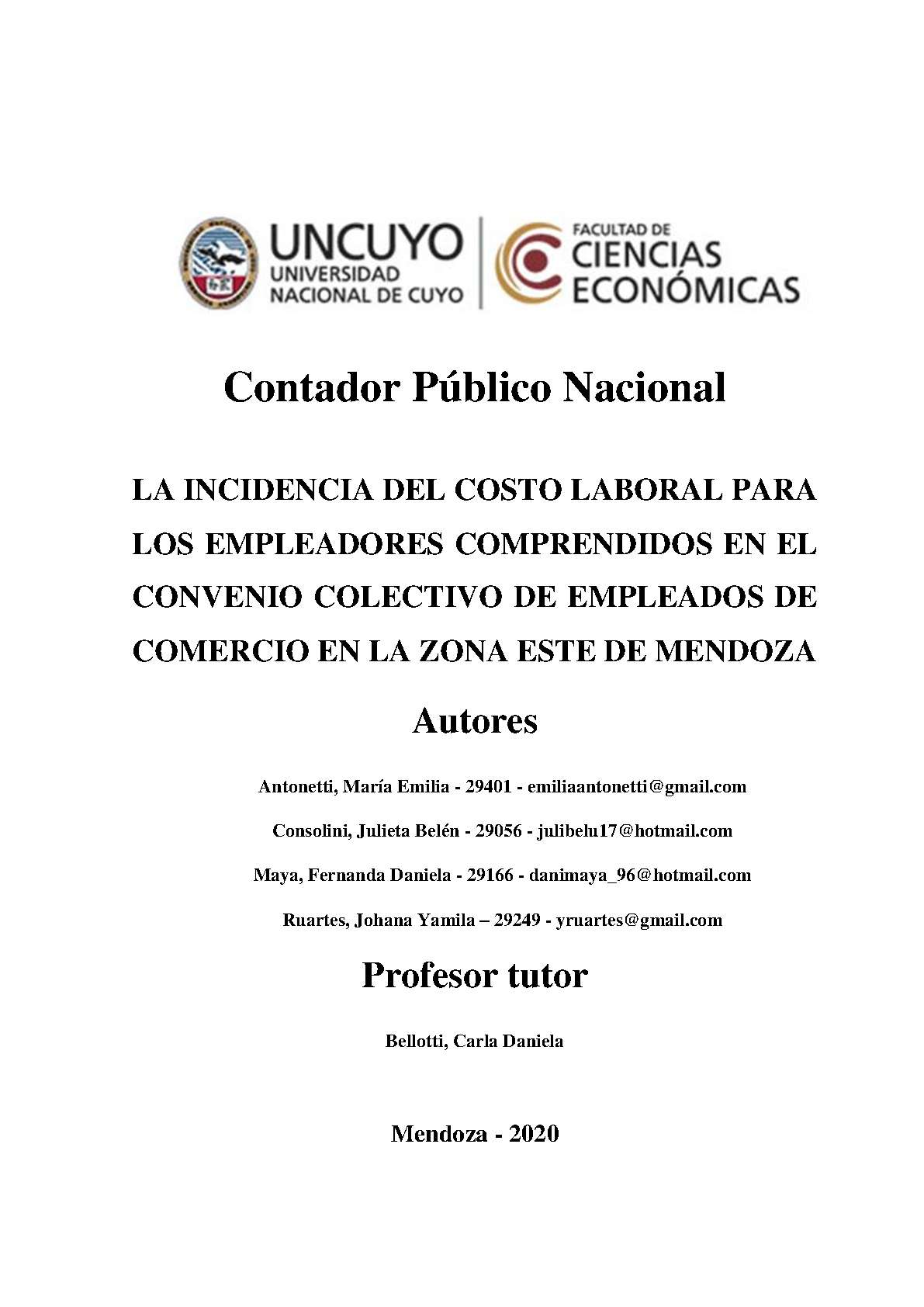 Antonetti, María Emilia; Consolini, Julieta Belén; Maya, Fernanda Daniela; Ruartes, Johana Yamila. (2020). La incidencia del costo laboral para los empleadores comprendidos en el convenio colectivo de empleados de comercio en la zona este de Mendoza: (Tesina de grado). Mendoza, Universidad Nacional de Cuyo. Facultad de Ciencias Económicas.