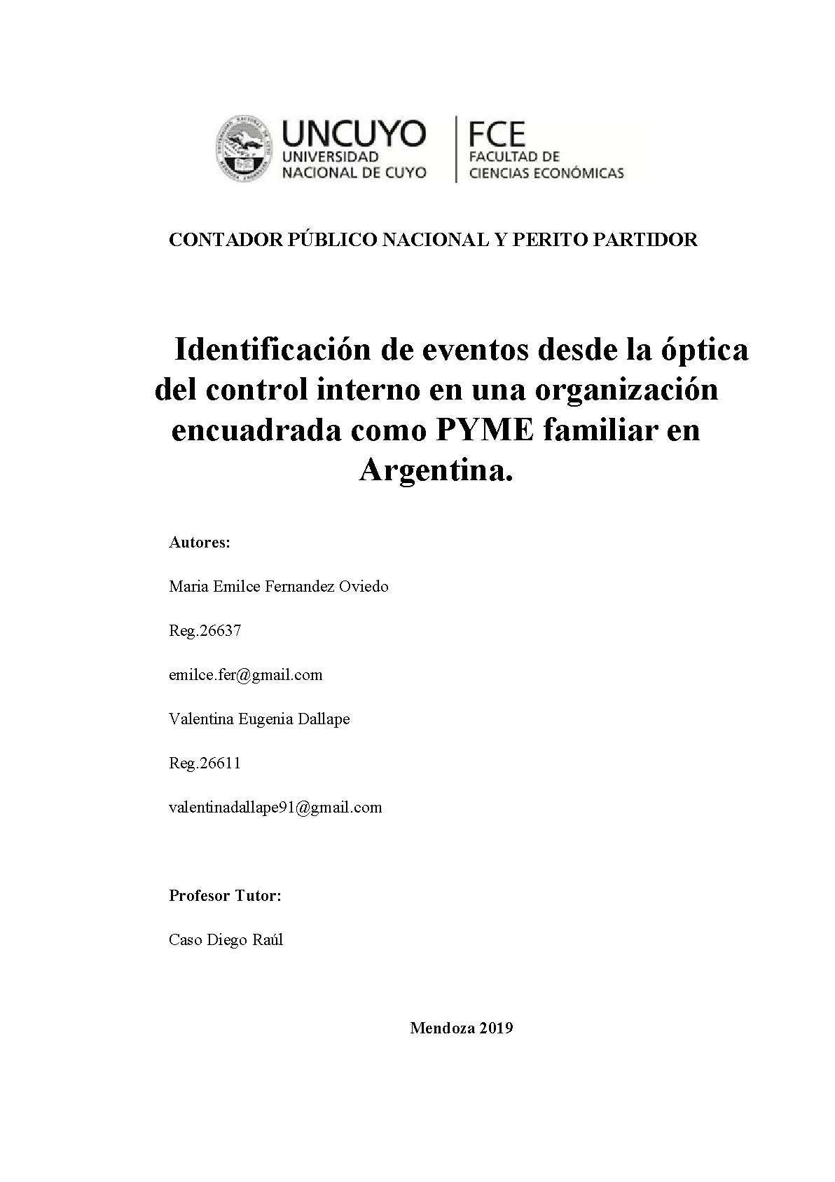 Fernández Oviedo, María Emilce; Dallape, Valentina Eugenia. (2019). Identificación de eventos desde la óptica del control interno en una organización encuadrada como PYME familiar en Argentina: (Tesina de grado). Mendoza, Universidad Nacional de Cuyo. Facultad de Ciencias Económicas.