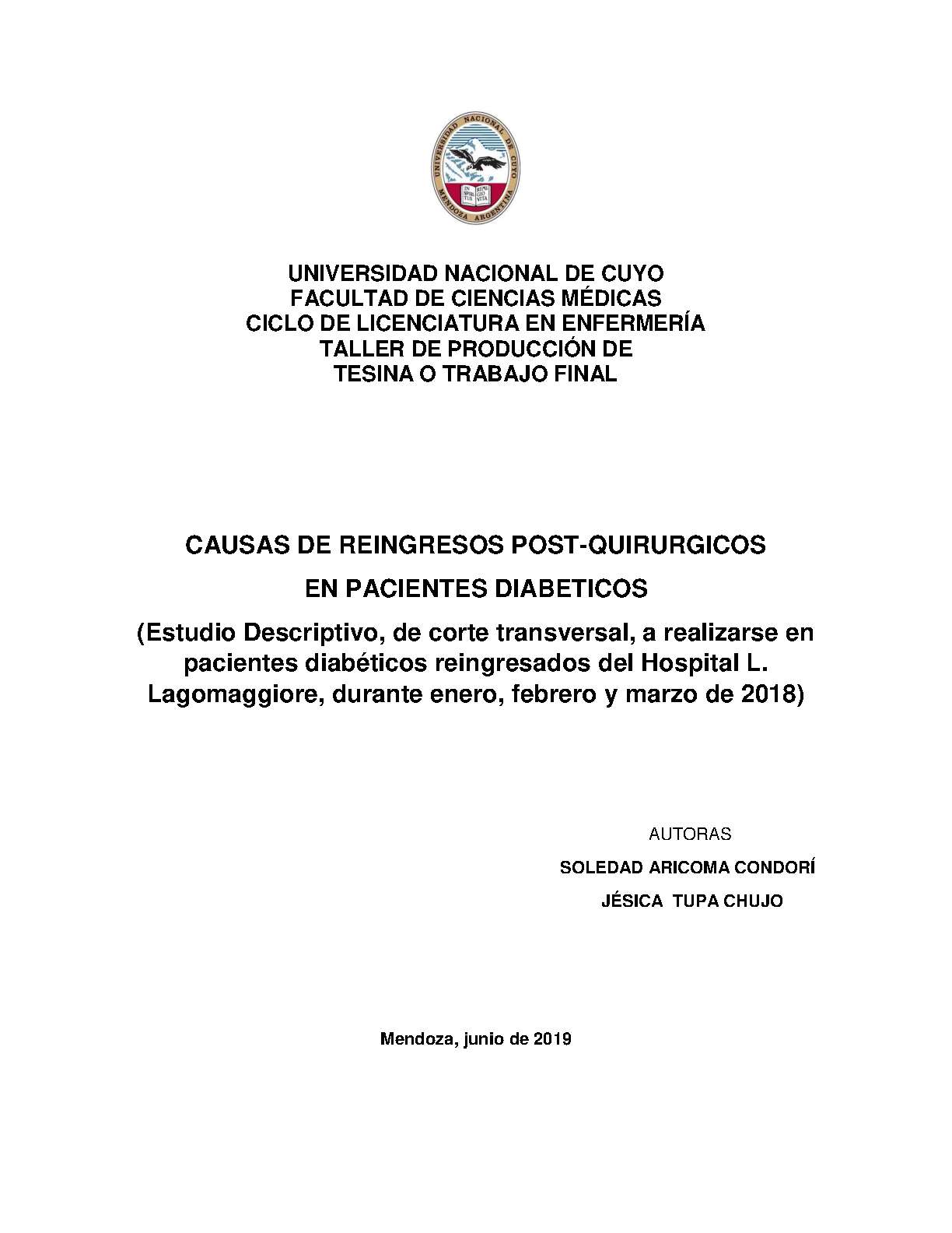 En el servicio de traumatología del hospital Luis Lagomaggiore, se ha observado un incremento en el índice de re-internaciones hospitalarias de pacientes diabéticos durante el mes de enero, febrero y marzo. Dichos pacientes habían ingresado anteriormente por la infección de una herida en un dedo o en alguna zona del miembro inferior y con una cetoacidosis (algunos casos). Las acciones de enfermería por lo general siempre se centraron en cumplir con las indicaciones médicas, curación de la herida tanto pre y postquirúrgica, educación del paciente diabético y la familia sobre la importancia de una alimentación saludable, la realización de ejercicios y los cuidados que debe tener en cuanto a la herida quirúrgica. Este estudio de tipo cuantitativo y transversal, tiene como objetivo averiguar y determinar cuáles son las causas de reingresos post-quirúrgicos en pacientes diabéticos, en el hospital L. Lagomaggiore, durante los meses de febrero, marzo y abril de 2018.