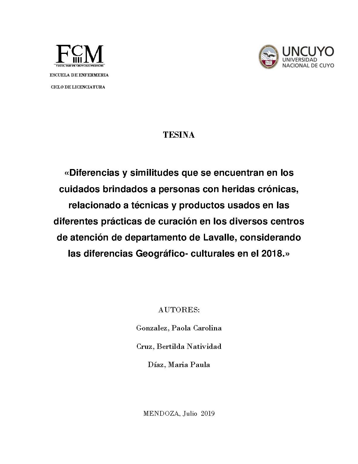 Diferencias y similitudes que se encuentran en los cuidados brindados a personas con heridas crónicas, relacionado a técnicas y productos usados en las diferentes prácticas de curación en los diversos centros de atención de departamento de Lavalle, considerando las diferencias geográfico- culturales en el 2018