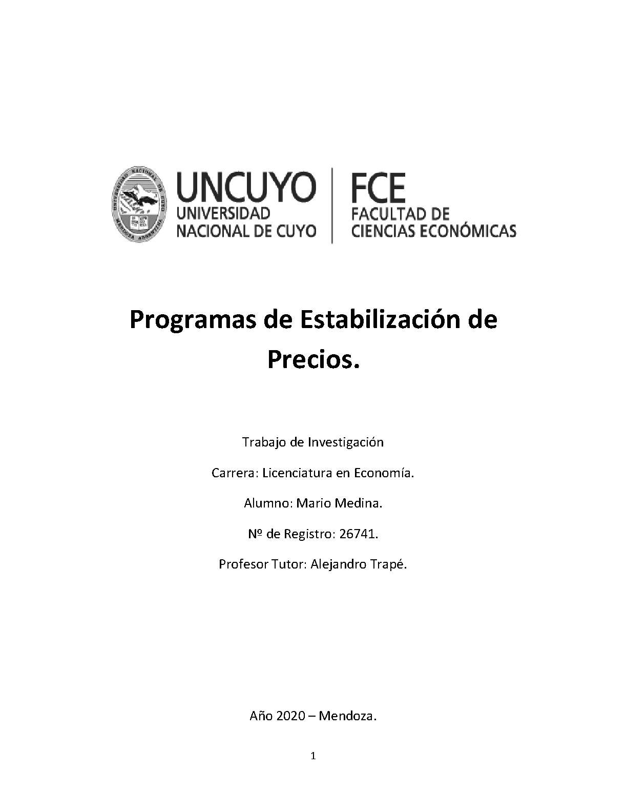 En el presente trabajo se analizarán programas de estabilización de precios que fueron aplicados con el propósito de equilibrar las variables macroeconómicas, en particular la inflación.
