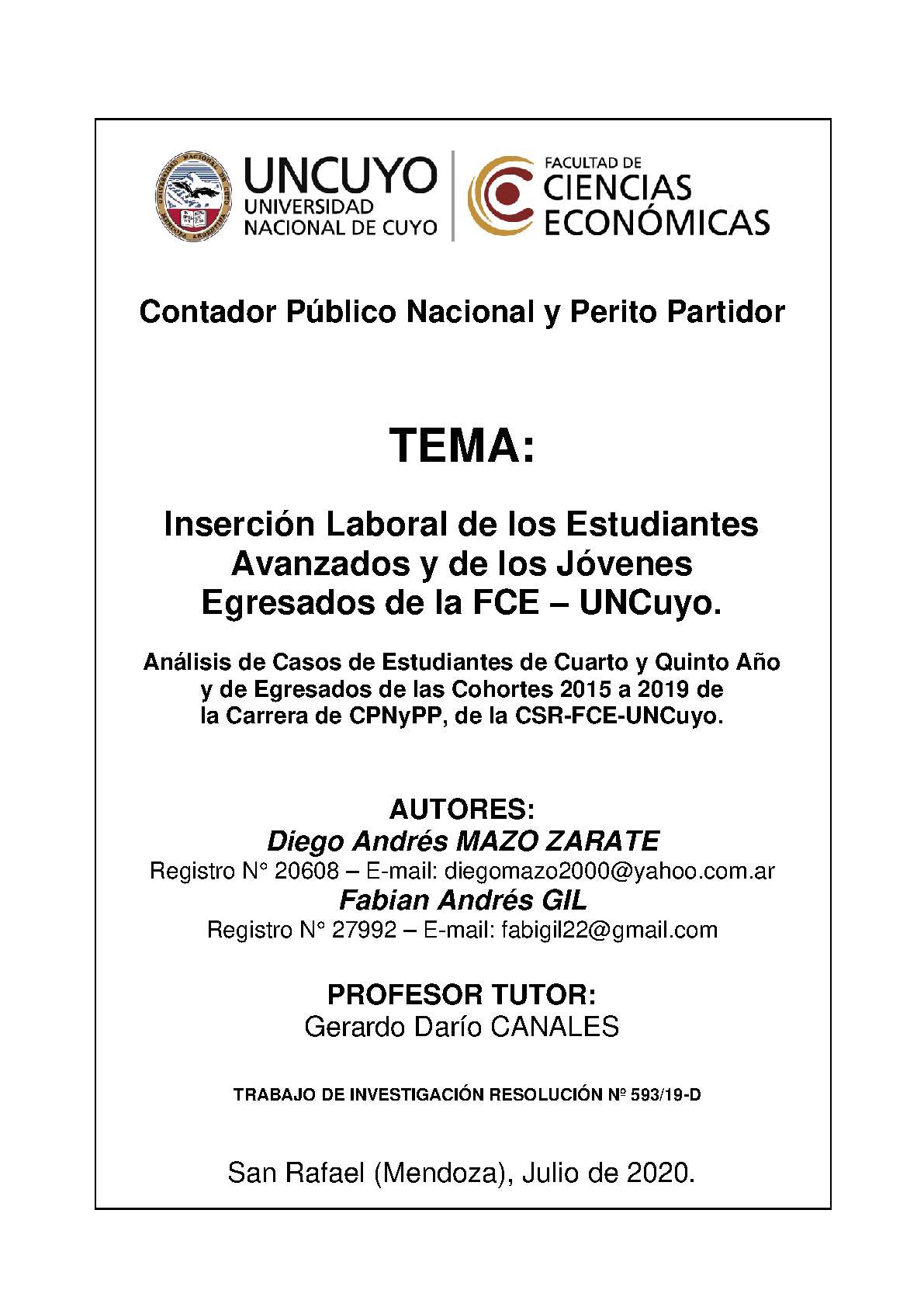 Inserción laboral de los estudiantes avanzados y de los jóvenes egresados de la FCE – UNCuyo