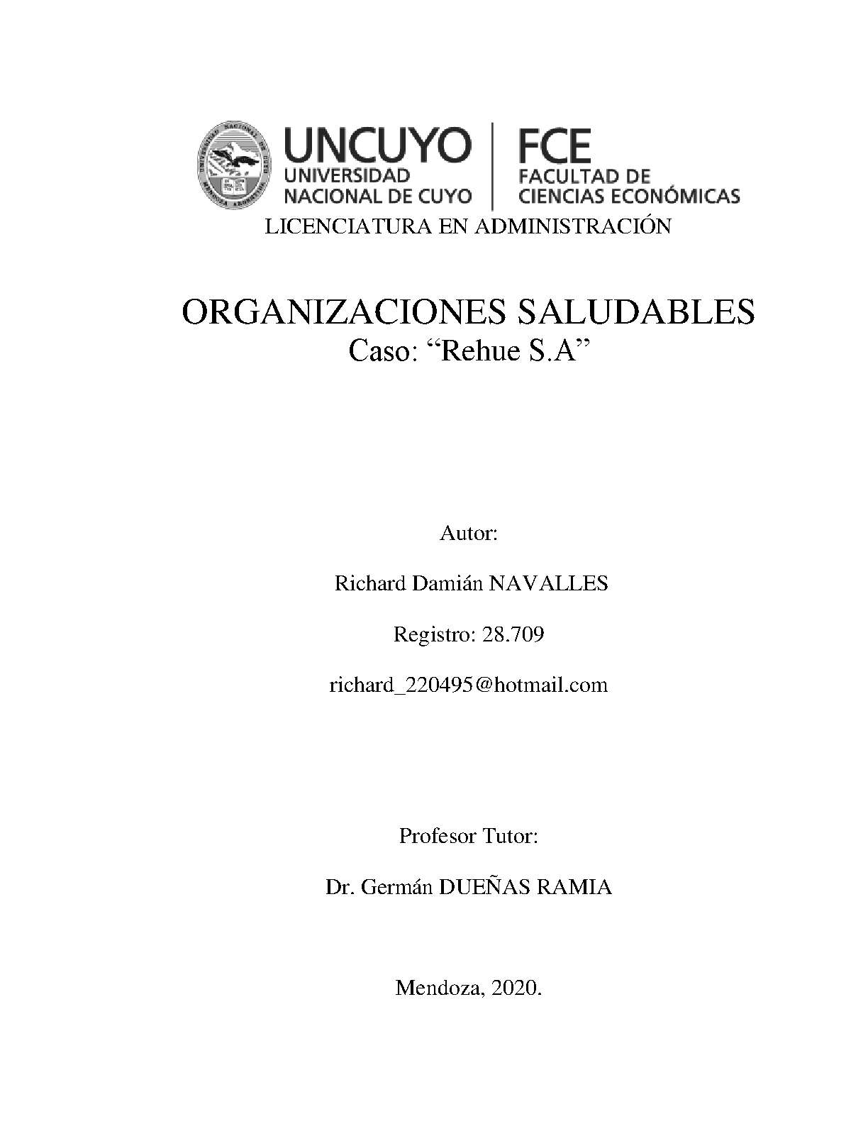 Las organizaciones saludables y sus aplicaciones ha sido el foco principal de la presente investigación. Proponemos indagar si la empresa bajo análisis, Rehue S.A, puede ser considerada como una organización saludable analizada en relación con los parámetros de incorporación y preservación del empleado en sus funciones. Mediante la aplicación de un modelo de organización saludable de elaboración propia.