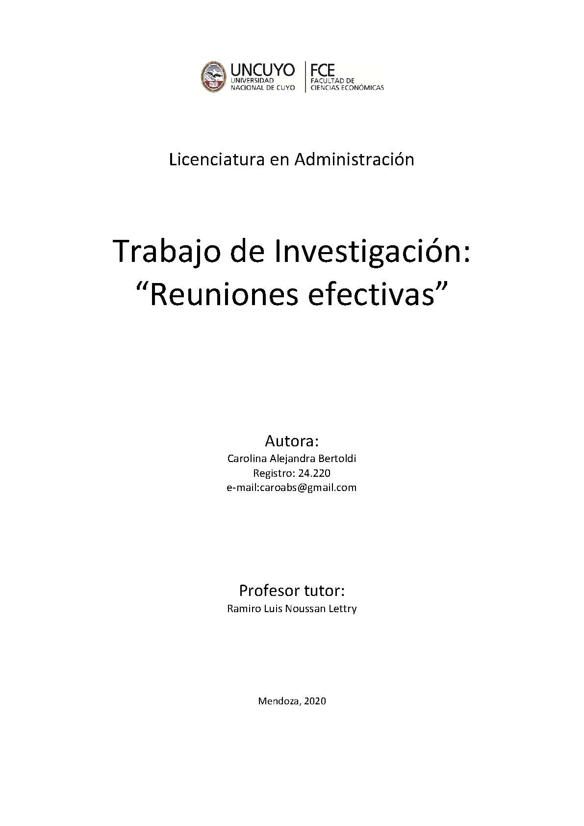 El presente trabajo se trata básicamente de una investigación aplicada que intenta buscar posibles causas en cuanto a la efectividad de las reuniones. En un primer segmento se realizó un relevamiento de información relativo a distintos tipo de reuniones, modalidades, factores que predisponen a su éxito, factores que predisponen a su fracaso, elementos que se recomiendan incluir, entrevistas de opiniones sobre el tema y otro tipo de información. Luego se realizó un breve trabajo de campo, donde se relevó información exclusivamente para este trabajo y se introdujeron algunos elementos recomendados en la sección previa. Finalmente, se realiza un aporte, desde una perspectiva sistémica, considerando a las reuniones como un