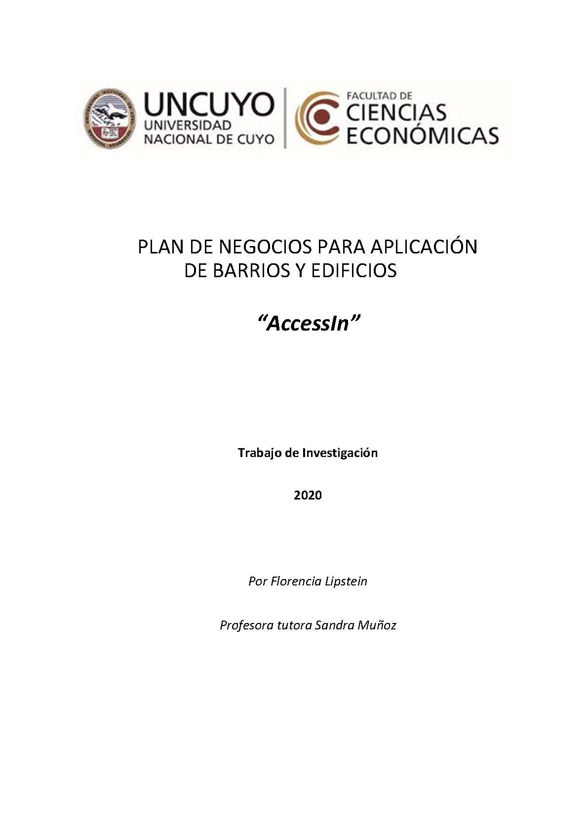 El presente trabajo de investigación tiene como objetivo plasmar la situación actual de la empresa AccessIn y realizar una proyección de la misma en el futuro, tanto cualitativa como cuantitativamente. También creemos que le servirá a los actuales socios para tener visión más clara de la estructura y organización de la empresa, y además para tomar acciones en un futuro.