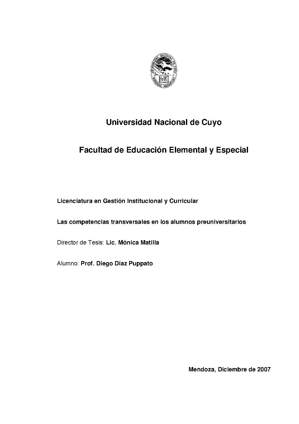 Díaz Puppato, Diego. (2007). Las competencias transversales en los alumnos preuniversitarios: (Tesina de grado). Mendoza, Universidad Nacional de Cuyo. Facultad de Educación Elemental y Especial .