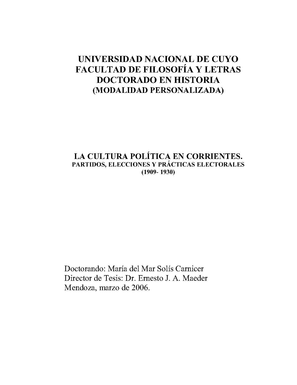 Solís Carnicer, María del Mar. (2006). La cultura política en Corrientes: partidos, elecciones y prácticas electorales (1909- 1930) (Tesis de Doctorado). Mendoza, Universidad Nacional de Cuyo. Facultad de Filosofía y Letras .