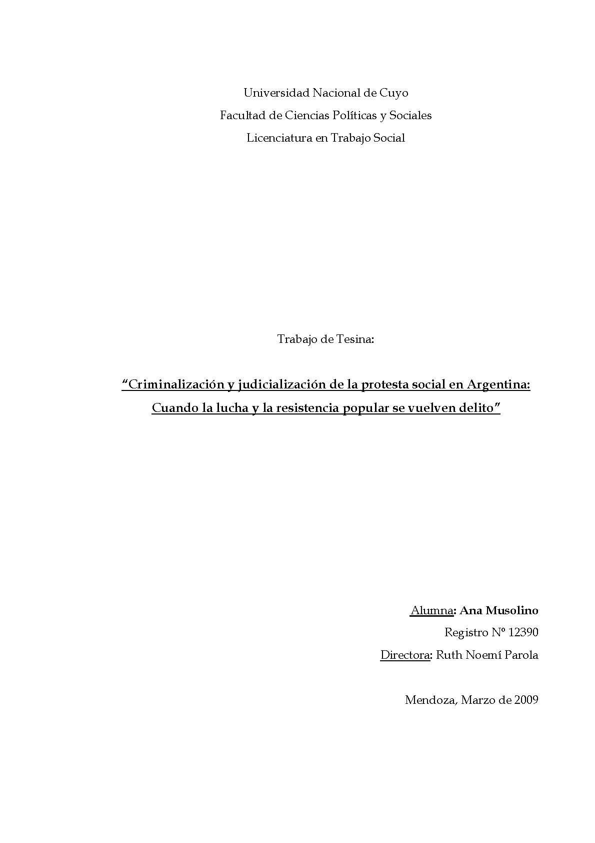 ARGENTINA - TRABAJO SOCIAL - CRIMINALIZACIÓN - MOVIMIENTOS DE PROTESTA - DERECHO CONSTITUCIONAL - POLÍTICA SOCIAL - MOVIMIENTOS SOCIALES - CONFLICTO SOCIAL - CONTROL SOCIAL - ESTADO - CAPITALISMO - SISTEMA JUDICIAL - CONSENSO - NEOLIBERALISMO - DERECHO PENAL - CIUDADANÍA - DEMOCRACIA - MEDIOS DE COMUNICACIÓN DE MASAS