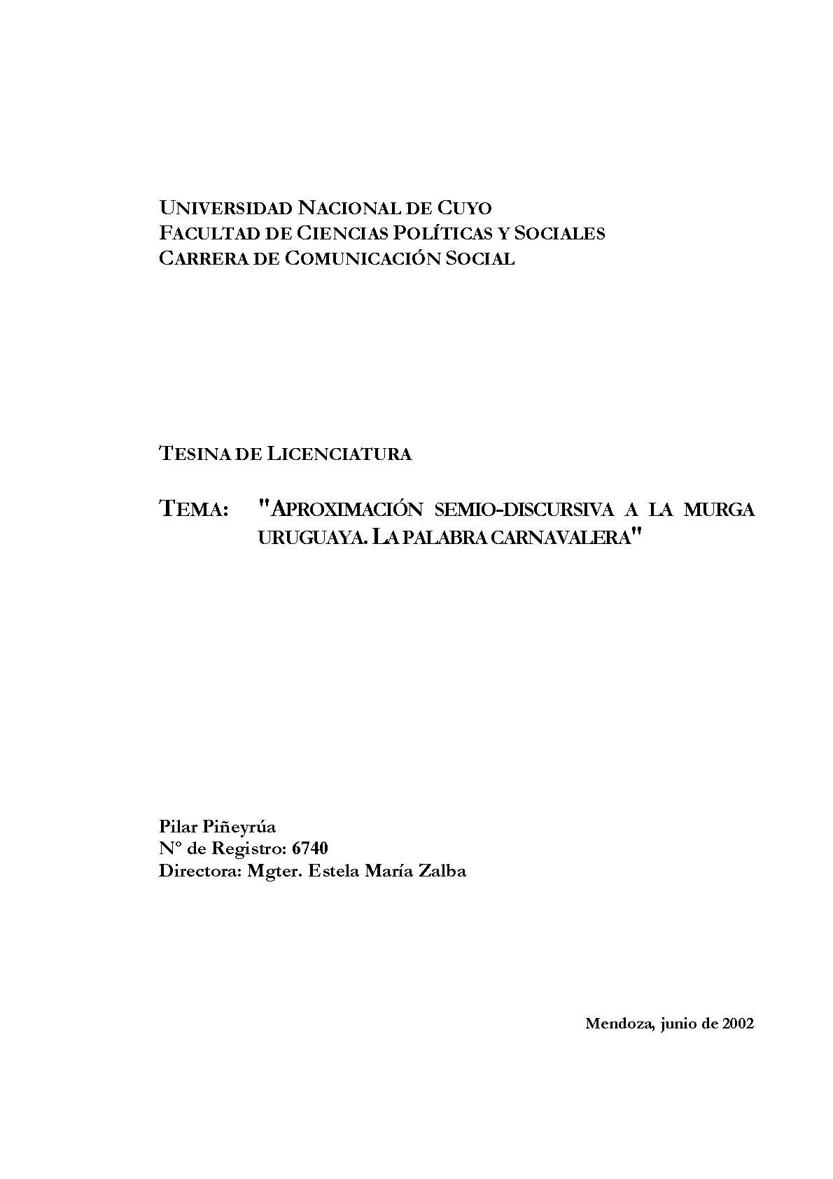 Piñeyrúa, Pilar. (2002). Aproximación semio-discursiva a la murga uruguaya: la palabra carnavalera (Tesina de grado). Mendoza, Universidad Nacional de Cuyo. Facultad de Ciencias Políticas y Sociales .