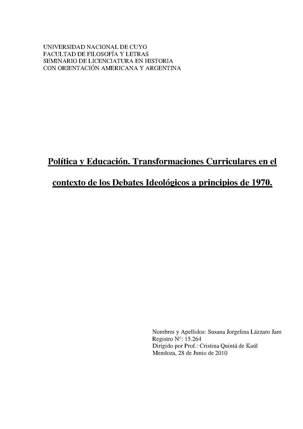 Lázzaro Jam, Susana Jorgelina. (2010). Política y educación: transformaciones curriculares en el contexto de los debates ideológicos a principios de 1970. (Tesina de grado). Mendoza, Universidad Nacional de Cuyo. Facultad de Filosofía y Letras .