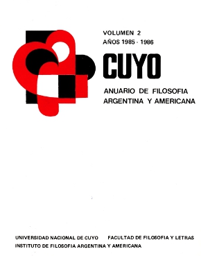 CUYO is a yearly publication of the Institute of Argentine and American Philosophy (the American Continent as a whole) of the Faculty of Philosophy and Literature of Cuyo University (Mendoza, Argentina). This publication contains research papers on Philosophy, History of Argentine and American Philosophy, History of American Ideas, and related disciplines. In its “Texts" section, it recovers for publication unpublished writings and ancient works and documents. Since 1965, CUYO has provided a space for the exchange of opinions and critical analysis with a scientific note, addressed not only to the specialized reader but also to the general public. This publication is included in the Handbook of Latin American Studies of the Library of Congress, in the Directory of Social Sciences and in the Latindex. Every opinion expressed here by the authors is their own responsibility. Traducciones al inglés: Néstor Chiapetta.