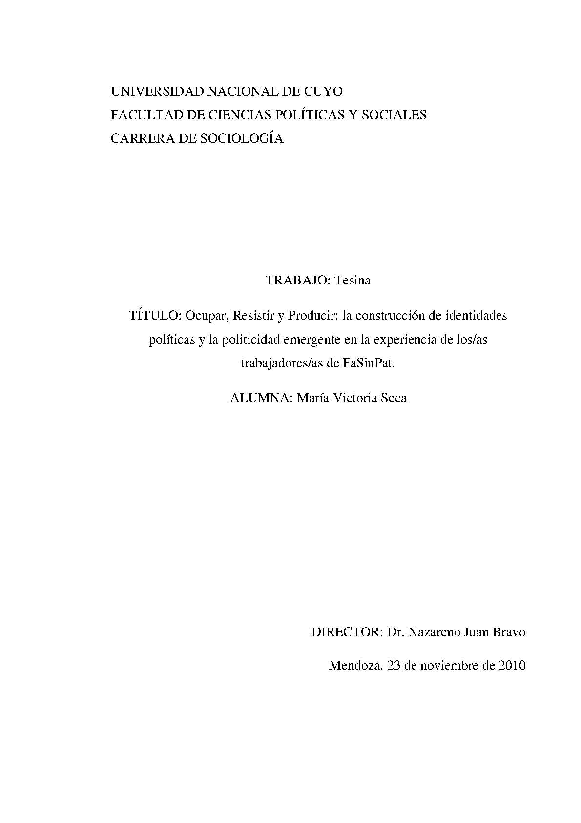 Seca, María Victoria. (2010). Ocupar, resistir y producir: la construcción de identidades políticas y la politicidad emergente en la experiencia de los/as trabajadores/as de FaSinPat (Tesina de grado). Mendoza, .