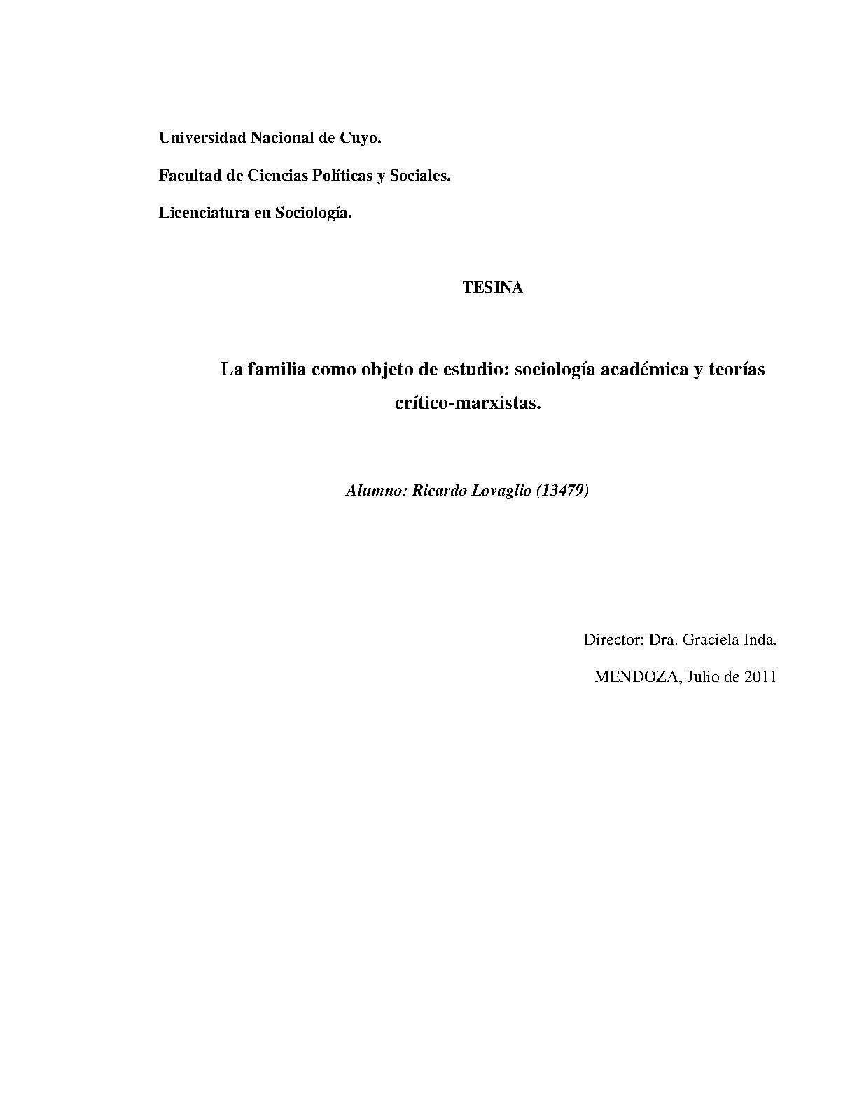 MENDOZA (ARGENTINA) - FAMILIA - MARXISMO - FUNCIONALISMO - ALTHUSSER, LOUIS - DURKHEIM, EMILE - ESTRUCTURA SOCIAL - HORKHEIMER, MAX - PARSONS, TALCOTT - MERTON, ROBERT - ENGELS, FEDERICO - ADORNO, THEODOR - ESTADO - PARENTESCO - FOUCAULT, MICHEL