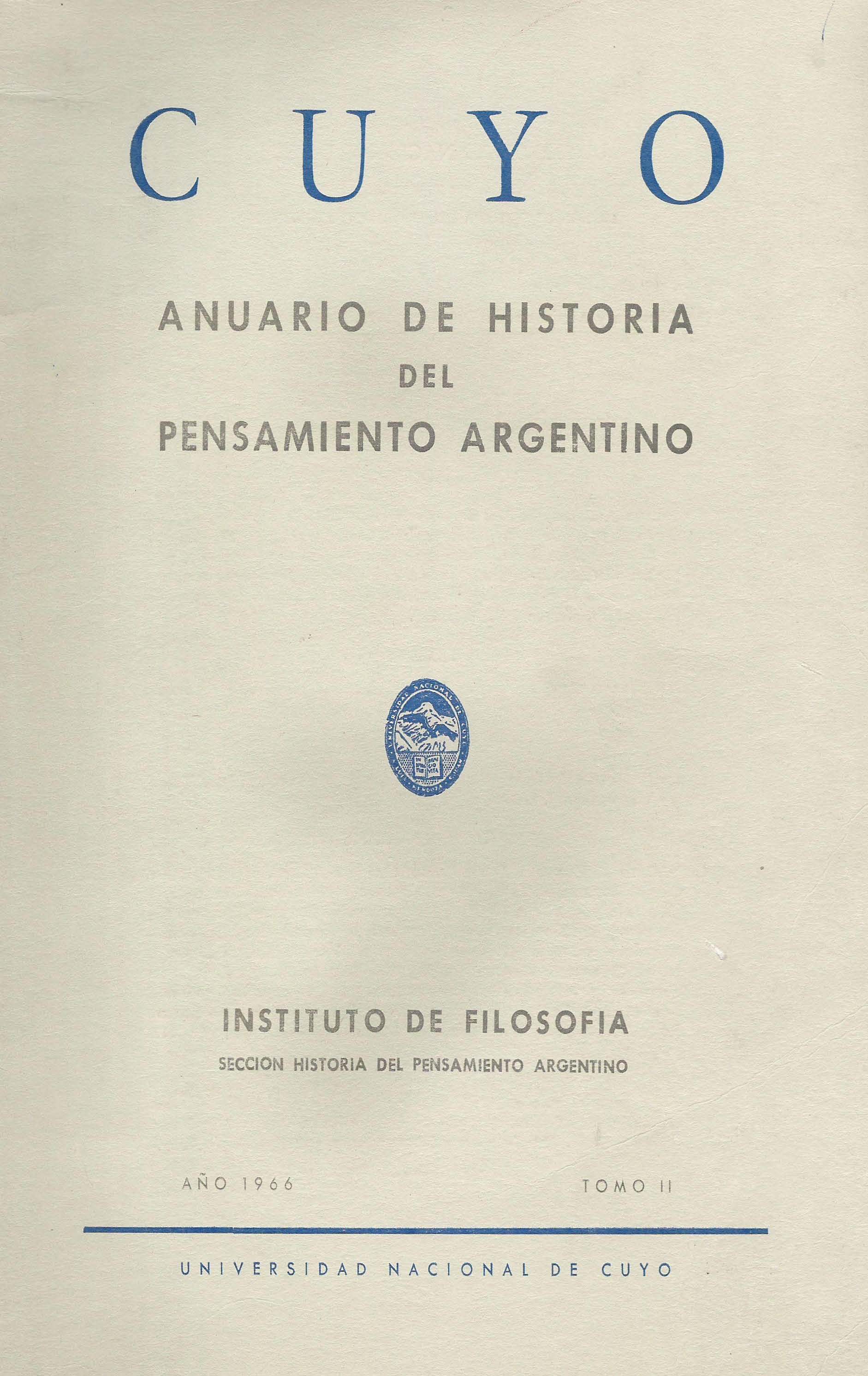 CUYO is a yearly publication of the Institute of Argentine and American Philosophy (the American Continent as a whole) of the Faculty of Philosophy and Literature of Cuyo University (Mendoza, Argentina). This publication contains research papers on Philosophy, History of Argentine and American Philosophy, History of American Ideas, and related disciplines. In its “Texts" section, it recovers for publication unpublished writings and ancient works and documents. Since 1965, CUYO has provided a space for the exchange of opinions and critical analysis with a scientific note, addressed not only to the specialized reader but also to the general public. This publication is included in the Handbook of Latin American Studies of the Library of Congress, in the Directory of Social Sciences and in the Latindex. Every opinion expressed here by the authors is their own responsibility.