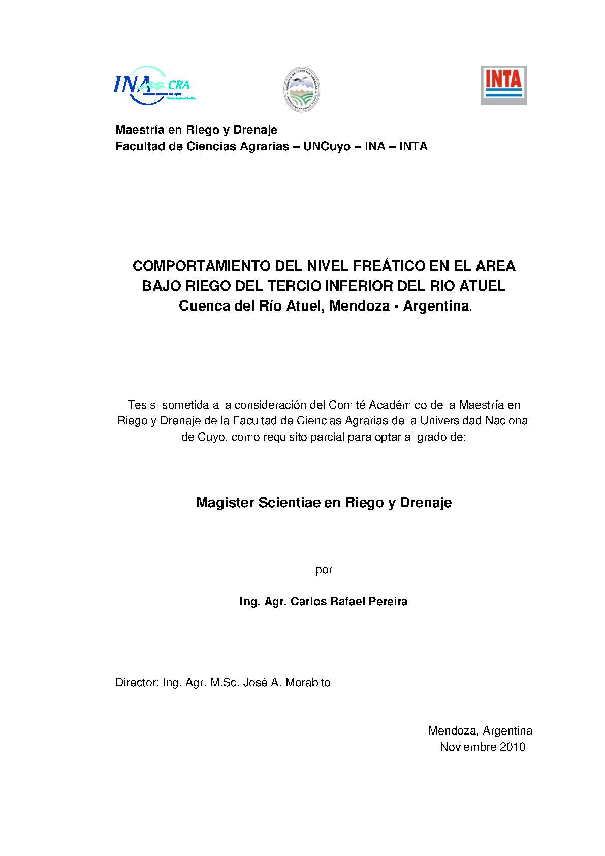 Pereira, Carlos Rafael. (2010). Comportamiento del nivel freático en el área bajo riego del tercio inferior del Río Atuel: cuenca del Río Atuel, Mendoza - Argentina. (Tesis de Maestría). Mendoza, Universidad Nacional de Cuyo. Facultad de Ciencias Agrarias .