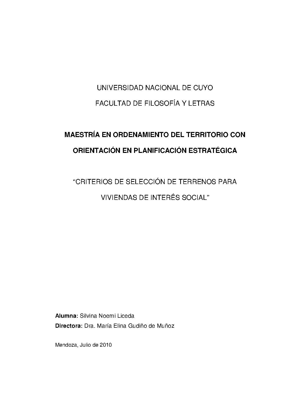 Liceda, Silvina Noemí. (2011). Criterios de selección de terrenos para viviendas de interés social: (Tesis de Maestría). Mendoza, Universidad Nacional de Cuyo. Facultad de Filosofía y Letras .