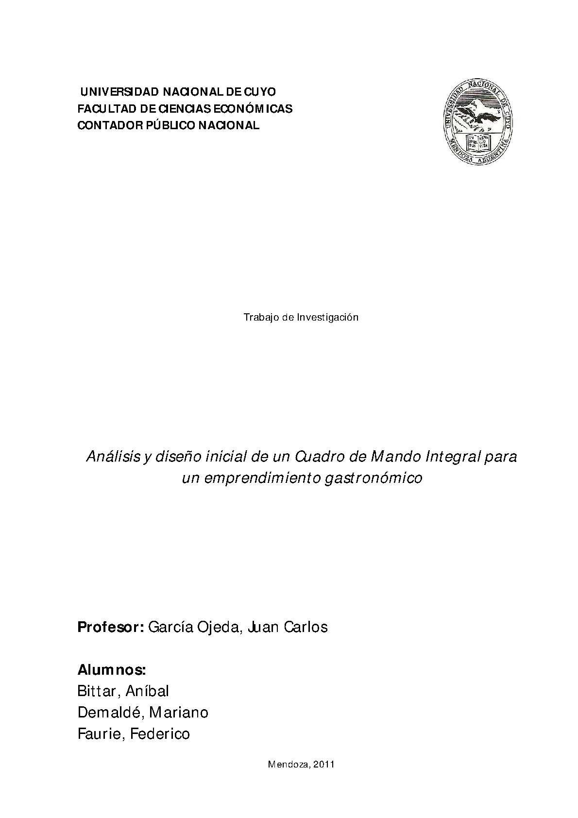 Bittar, Aníbal; Demaldé, Mariano; Faurie, Federico. (2011). Análisis y diseño inicial de un Cuadro de Mando Integral para un emprendimiento gastronómico: (Tesina de grado). Mendoza, Universidad Nacional de Cuyo. Facultad de Ciencias Económicas.