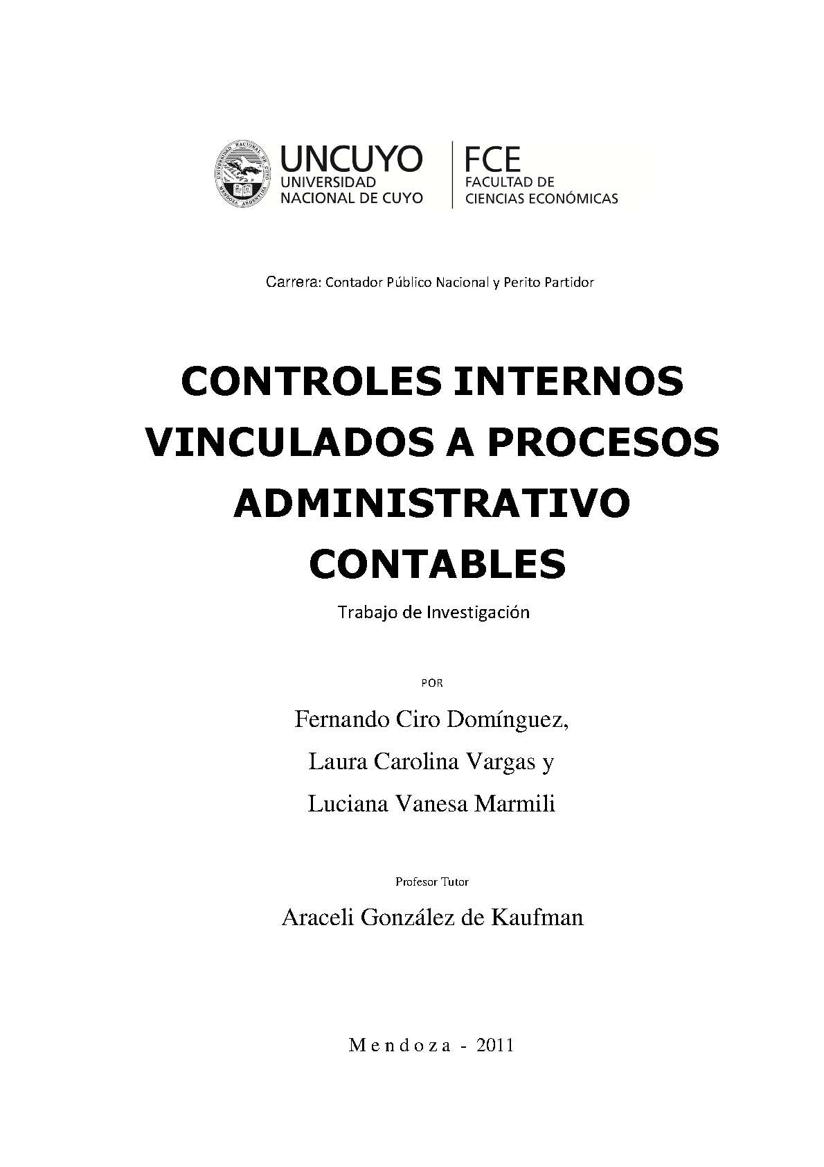 Domínguez, Fernando Ciro; Vargas, Laura Carolina; Marmili, Luciana Vanesa. (2011). Controles internos vinculados a procesos administrativos contables: (Tesina de grado). Mendoza, Universidad Nacional de Cuyo. Facultad de Ciencias Económicas.