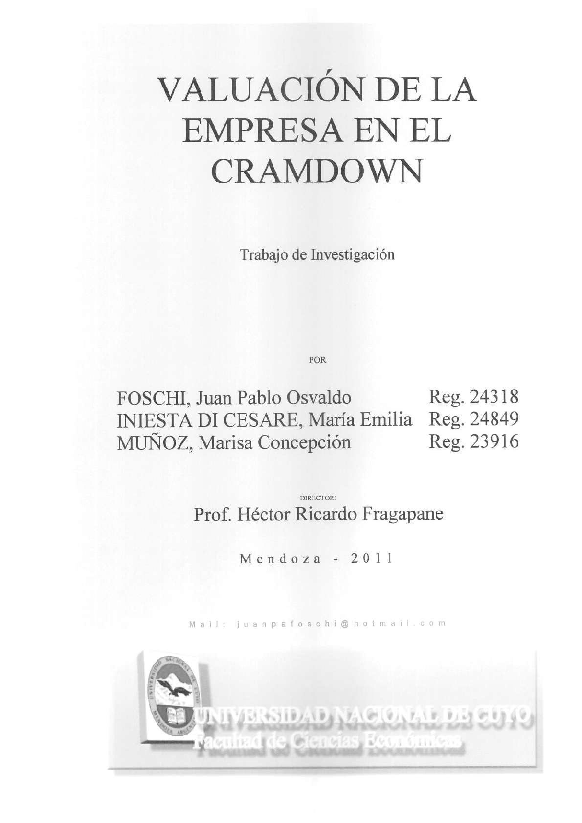 Foschi, Juan Pablo Osvaldo; Iniesta Di Cesare, María Emilia; Muñoz, Marisa Concepción. (2011). Valuación de la empresa en el cramdown: (Tesina de grado). Mendoza, Universidad Nacional de Cuyo. Facultad de Ciencias Económicas.