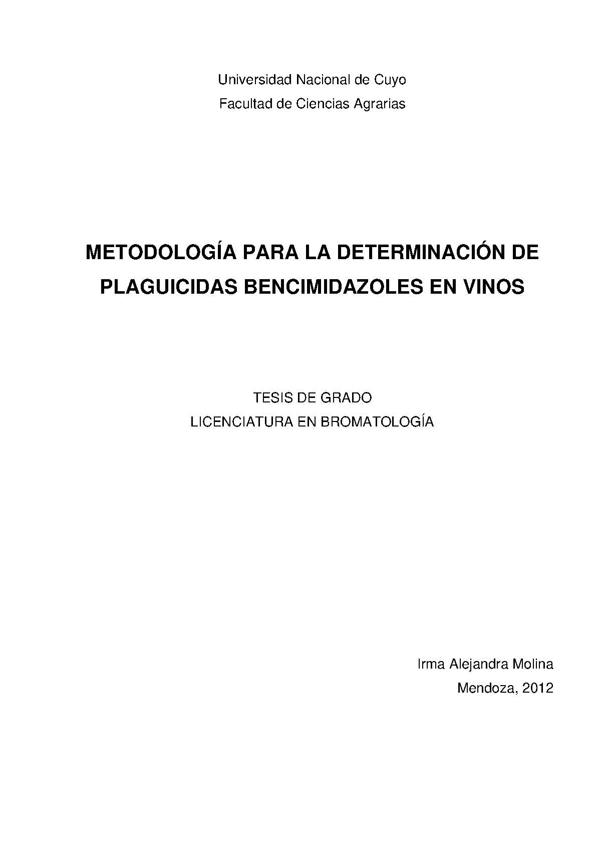 En la actualidad, benomil y carbendazim son los fungicidas bencimidazoles más utilizados en el cultivo de la vid para controlar la podredumbre de los racimos. El problema mayor se presenta cuando son necesarias aplicaciones en épocas muy cercanas a cosecha, permitiendo el pasaje de residuos de estos fungicidas desde uvas al mosto y luego al vino. En nuestro país está legislada la cantidad máxima de estos plaguicidas en uva en fresco, 3 ppm para benomil al igual que para carbendazim (SENASA, Resolución 934/10). El Codex alimentarius establece un LMR de 3 ppm para carbendazim en uva en fresco y no establece un LMR para el benomil. La Unión Europea establece un LMR de 0,5 ppm para el benomil y carbendazim (suma de benomil y carbendazim expresado como carbendazim). De esta manera es importante su determinación para evitar rechazos y de esta forma proteger la imagen y calidad de la producción nacional y garantizar la seguridad alimentaria de los consumidores.