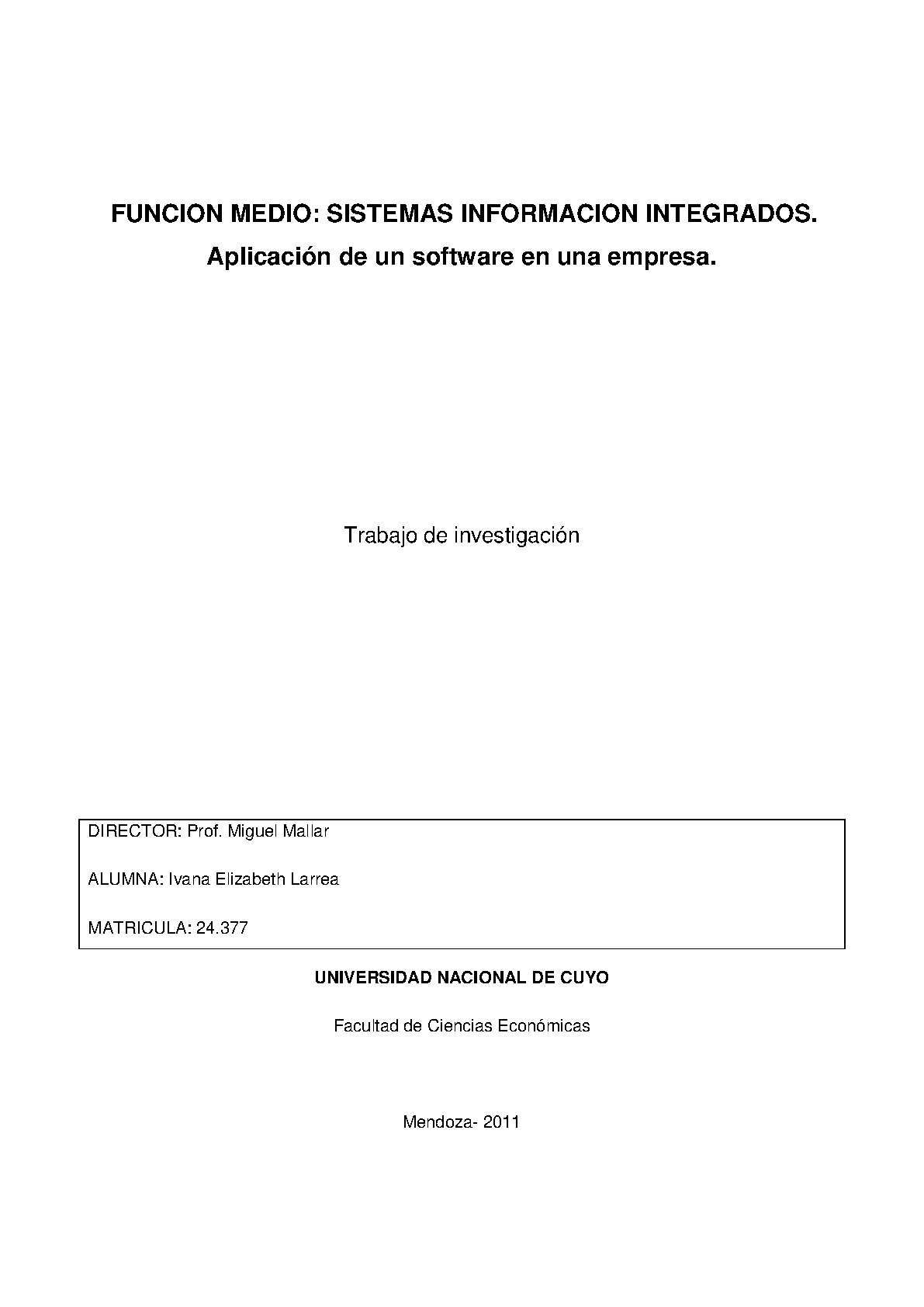 Larrea, Ivana Elizabeth. (2011). Función medio: sistemas de información integrados: aplicación de un software en una empresa (Trabajo final de grado). Mendoza, Universidad Nacional de Cuyo. Facultad de Ciencias Económicas.