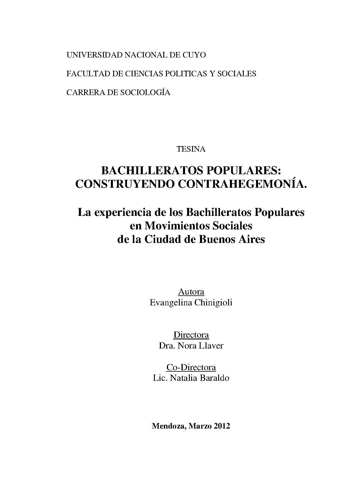La presente tesina se propone dar a conocer una experiencia política pedagógica nacida desde los Movimientos Sociales (MSs) durante los últimos años. Estamos hablando del surgimiento de Bachilleratos Populares (BP) de jóvenes y adultos gestionados y llevados a cabo desde los mismos Movimientos Sociales y organizaciones.