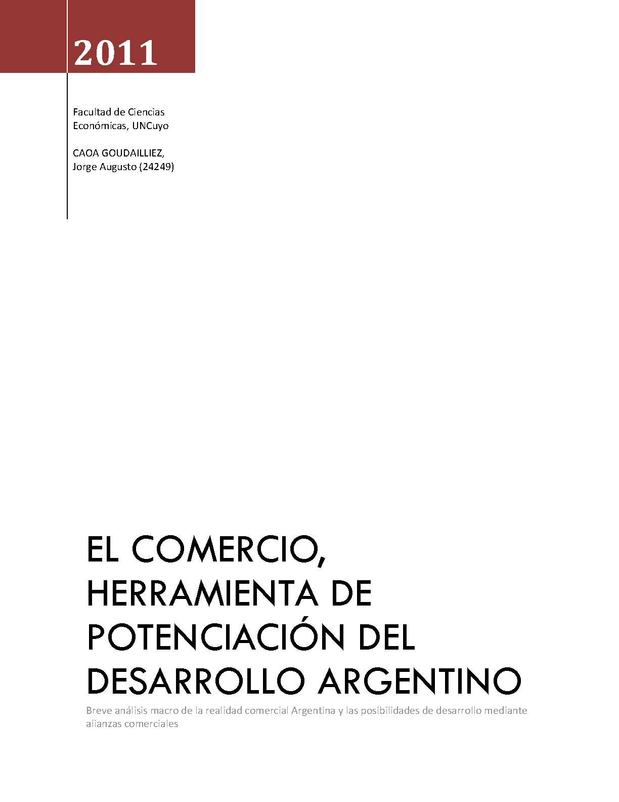 Caoa Goudailliez, Jorge Augusto. (2011). El comercio, herramienta de potenciación del desarrollo argentino: breve análisis macro de la realidad comercial argentina y las posibilidades de desarrollo mediante alianzas comerciales (Trabajo final de grado). Mendoza, Universidad Nacional de Cuyo. Facultad de Ciencias Económicas.