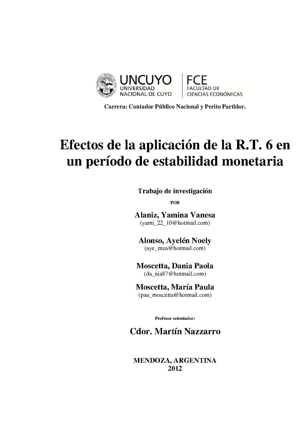 Efectos de la aplicación de la R.T. 6 en un período de estabilidad monetaria