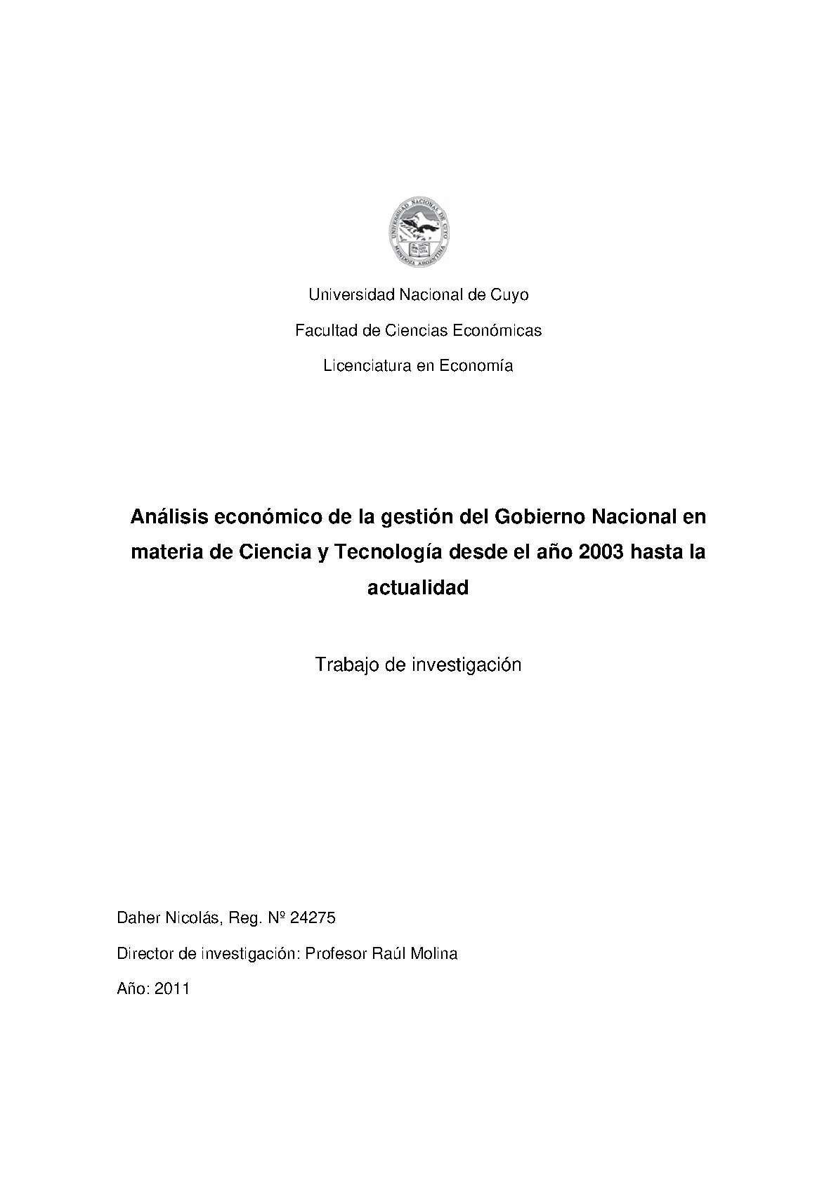 Daher, Nicolás. (2011). Análisis económico de la gestión del gobierno nacional en materia de ciencia y tecnología desde el año 2003 hasta la actualidad: (Tesina de grado). Mendoza, Universidad Nacional de Cuyo. Facultad de Ciencias Económicas.