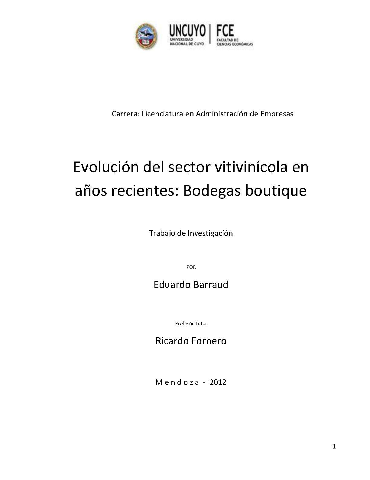 En el presente trabajo se investigará la evolución experimentada en el sector vitivinícola en la última década, analizando las razones de dicha evolución, el cambio en el consumo, la creciente demanda, la oferta cada vez más especializada, el impacto de las medidas económicas de los últimos tiempos, la inflación, el tipo de cambio de los principales países a los cuales exporta Argentina, así como también las crisis mundiales, con el objetivo final de entender la situación actual de las bodegas en Mendoza.