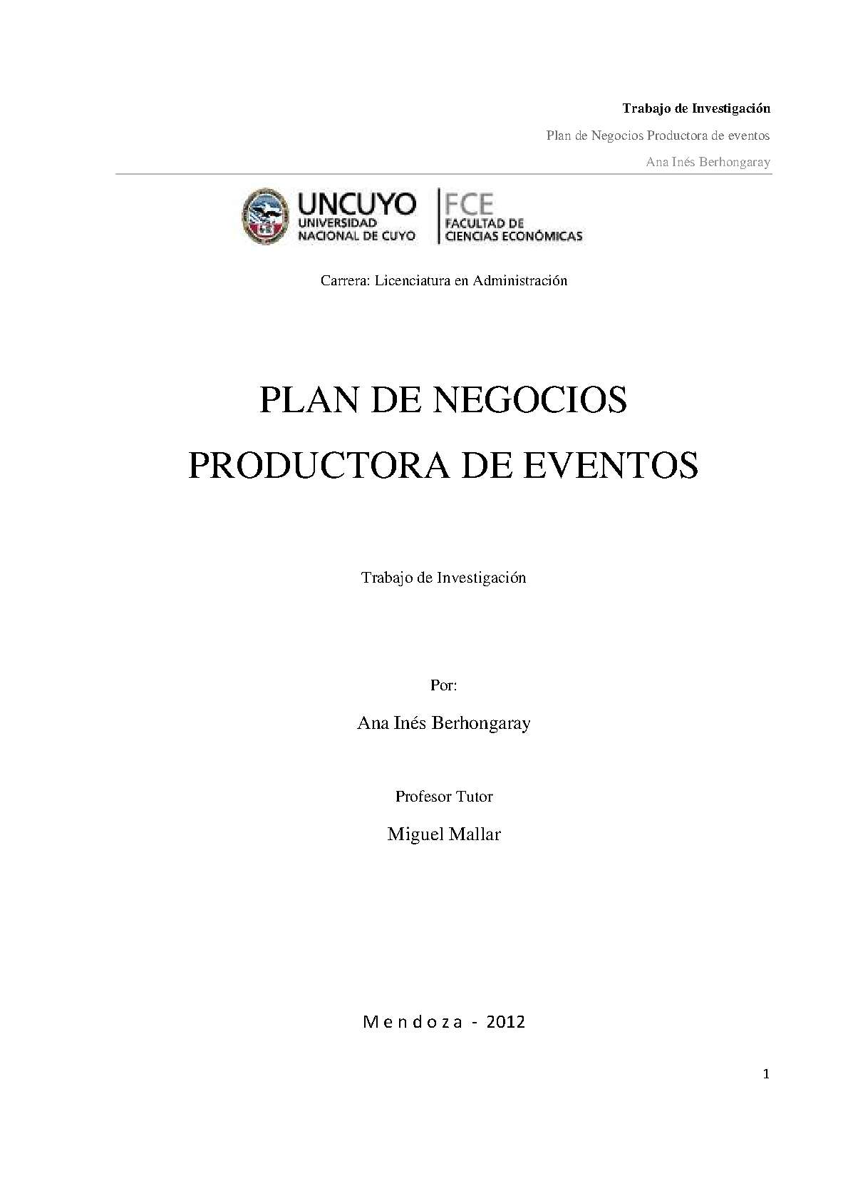 Berhongaray, Ana Inés. (2012). Plan de negocios productora de eventos: (Trabajo final de grado). Mendoza, Universidad Nacional de Cuyo. Facultad de Ciencias Económicas.