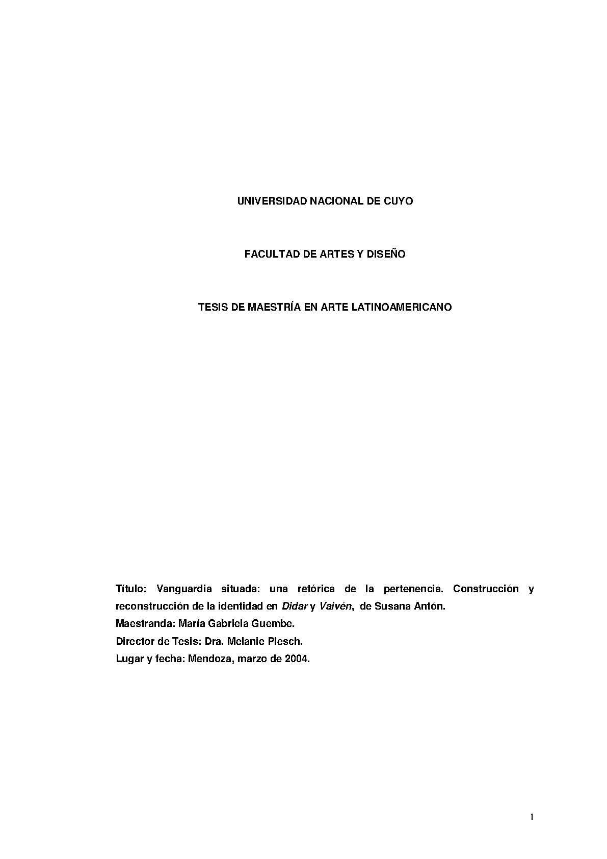 Guembe, María Gabriela. (2004). Vanguardia situada: una retórica de la pertenencia : construcción y reconstrucción de la identidad en Didar y Vaivén, de Susana Antón (Tesis de Maestría). Mendoza, Universidad Nacional de Cuyo. Facultad de Artes y Diseño .