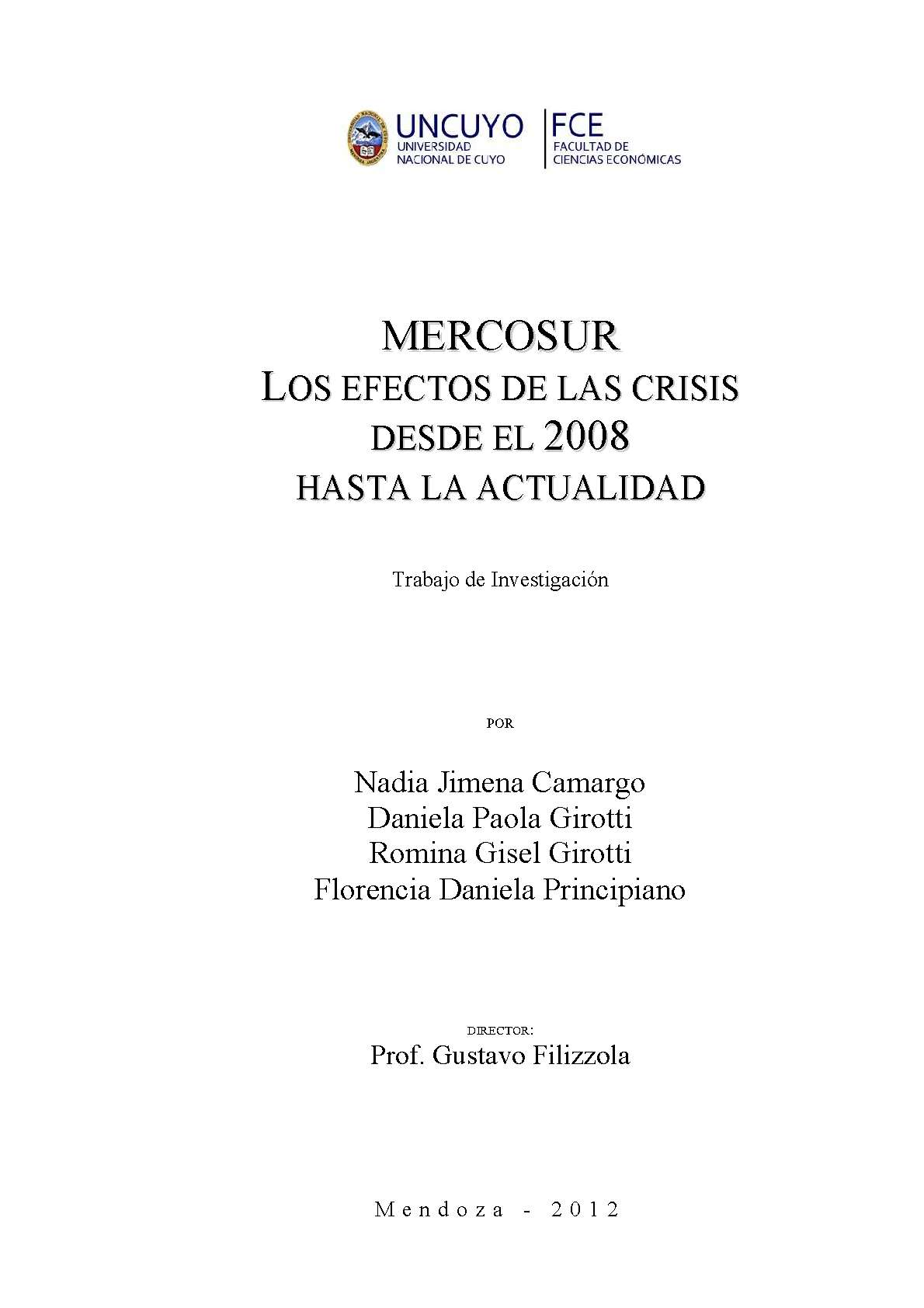 Camargo, Nadia Jimena; Girotti, Daniela Paola; Girotti, Romina Gisel; Principiano, Florencia Daniela. (2012). Mercosur, los efectos de las crisis desde el 2008 hasta la actualidad: (Trabajo final de grado). Mendoza, Universidad Nacional de Cuyo. Facultad de Ciencias Económicas.