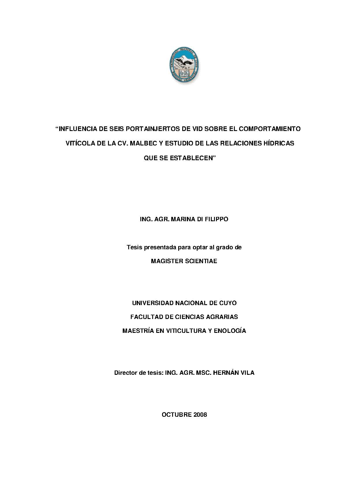 Di Filippo, Marina. (2008). Influencia de seis portainjertos de vid sobre el comportamiento vitícola de la cv. Malbec y estudio de las relaciones hídricas que se establecen: (Tesis de Maestría). Mendoza, Universidad Nacional de Cuyo. Facultad de Ciencias Agrarias .