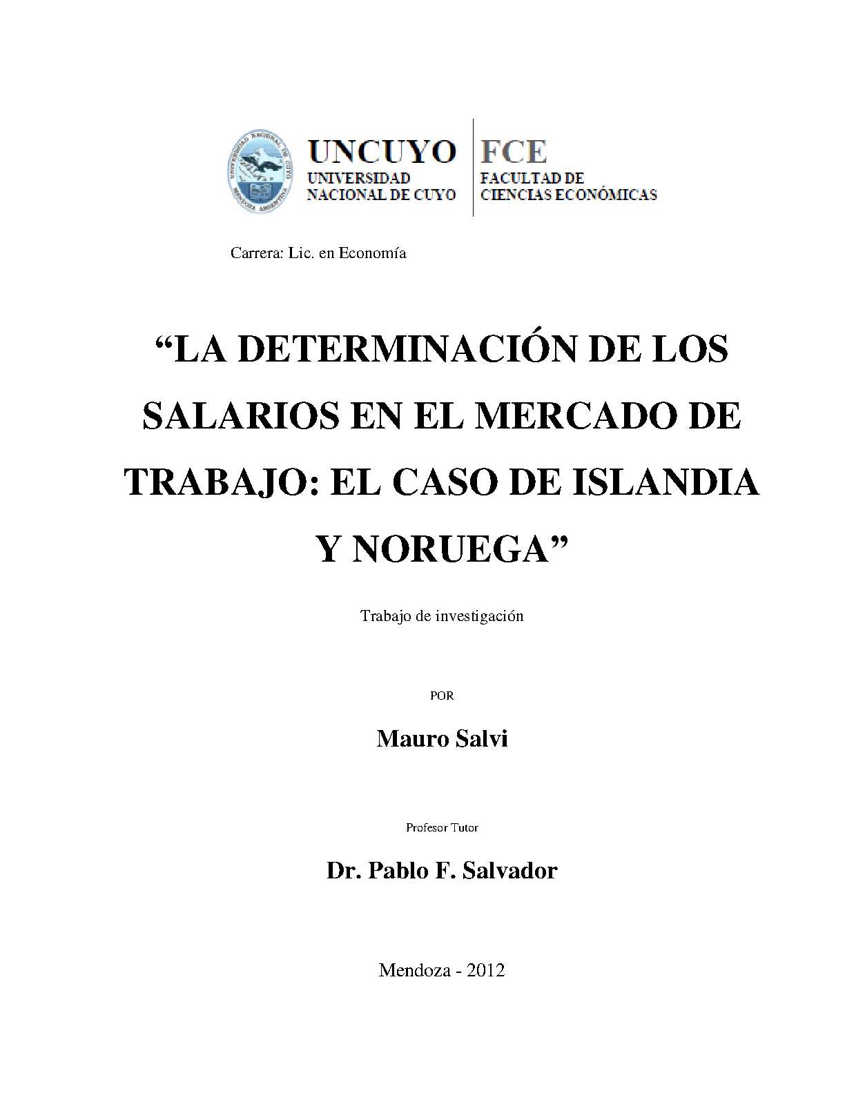 El objetivo de este trabajo es el de estimar ecuaciones de salarios individuales, según lo que postula la teoría de la reacción en cadena, para Islandia y Noruega con el objeto de establecer cuáles son los determinantes de los salarios en estos dos países nórdicos. Se espera que el presente trabajo brinde resultados que expliquen las causas de las variaciones mostradas por los salarios de ambos países en los últimos años, a partir de su relación directa con otras variables. A tal efecto, primero observaremos la evolución de los principales indicadores macroeconómicos de Islandia y Noruega y su posible relación directa con la tasa de desempleo y luego se analizarán detalladamente las distintas instituciones que componen sus mercados de trabajo, lo cual nos permitirá tener una visión general del funcionamiento macroeconómico de estos dos países y en particular, de sus respectivos mercados de trabajo. Asimismo, se examinarán las teorías económicas más relevantes que analizan el funcionamiento del mercado de trabajo desde una perspectiva macroeconómica, lo cual nos permitirá justificar nuestra elección para el posterior análisis empírico. Finalmente, se estimará una ecuación de salarios para cada país utilizando datos de la Organización para la Cooperación y el Desarrollo Económico (OECD por sus siglas en inglés) para el período 1960-2010 con el objetivo de identificar los determinantes de los salarios y calcular el impacto de éstos sobre los salarios a través del cálculo de elasticidades de corto y largo plazo.