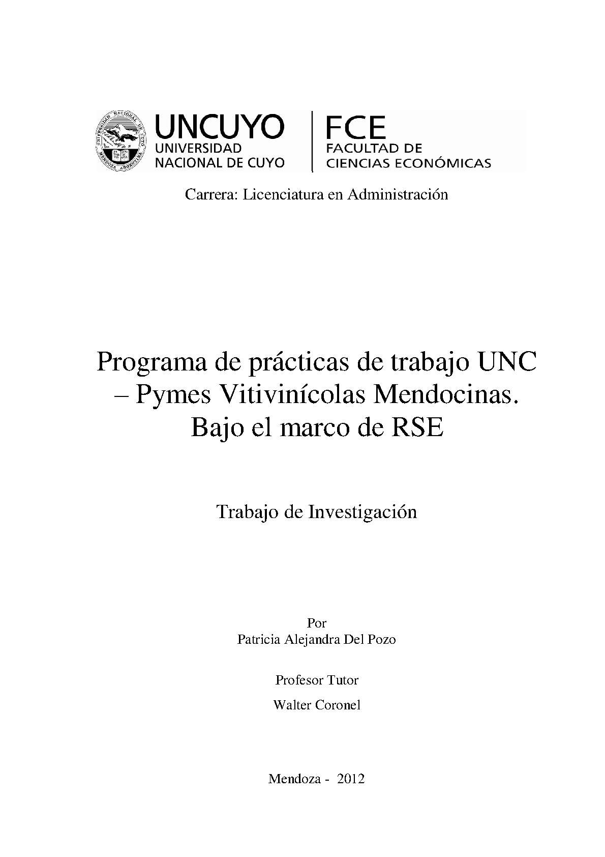 Del Pozo, Patricia Alejandra. (2012). Programa de prácticas de trabajo UNC–Pymes vitivinícolas mendocinas: bajo el marco de RSE (Trabajo final de grado). Mendoza, Universidad Nacional de Cuyo. Facultad de Ciencias Económicas.