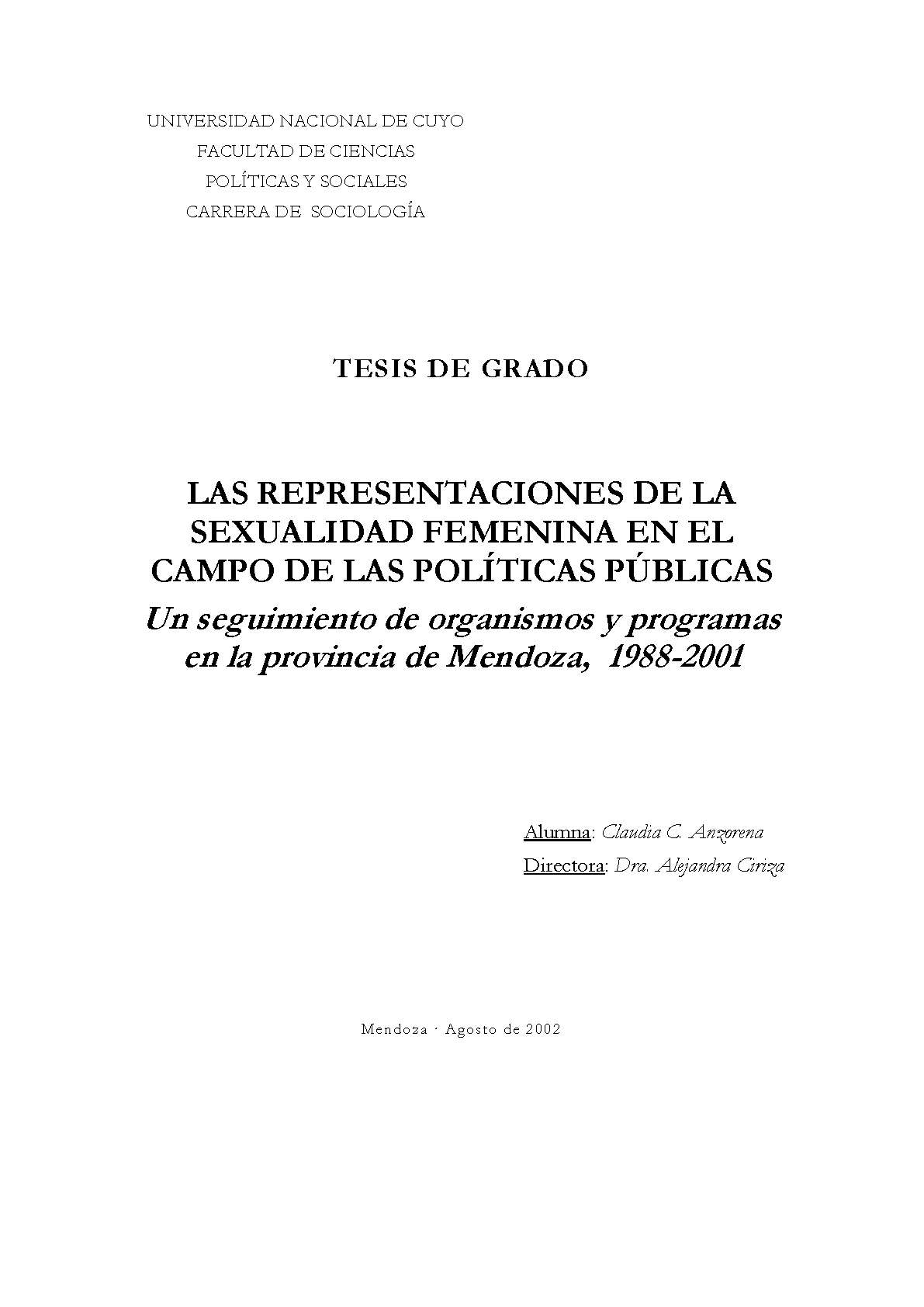 El tema de investigación de esta tesis consiste en las representaciones de la sexualidad femenina inscriptas en las políticas públicas implementadas por los Estados después de asumir los compromisos correspondientes en las distintas conferencias de las Naciones Unidas. Nos hemos centrado en la descripción y el análisis de las políticas referidas a salud y derechos sexuales y reproductivos en la provincia de Mendoza, procurando realizar un seguimiento histórico que abarca desde el momento de la formación de los organismos encargados de la ejecución de las políticas públicas hacia mujeres hasta el presente. La investigación, elaborada desde un punto de vista teórico de género, implica considerar tanto los procesos que llevaron a los Estados a intervenir en relación con la vida de las mujeres; como la perspectiva de las actoras y los actores sociales y estatales.