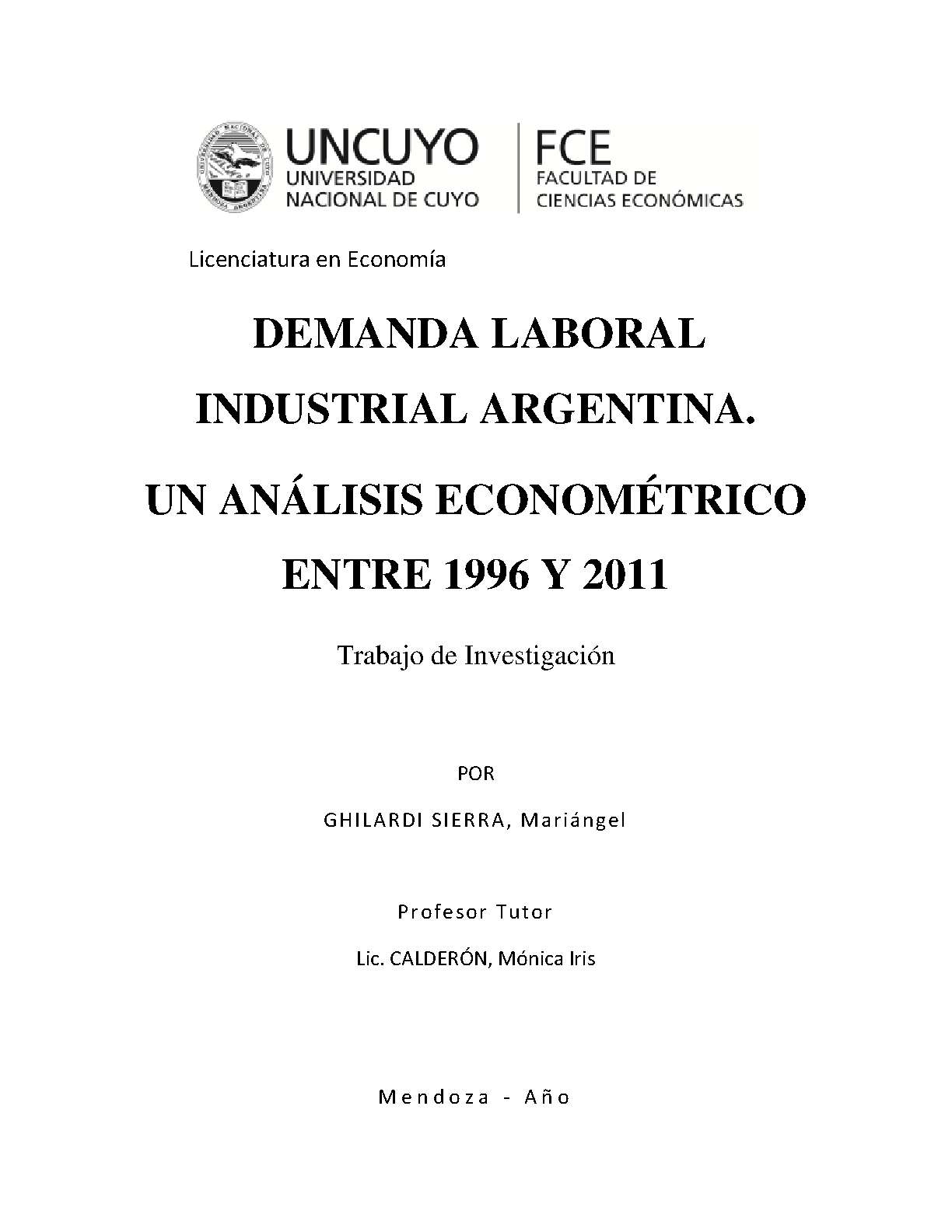 Ghilardi Sierra, Mariángel. (2013). Demanda laboral industrial argentina: un análisis econométrico entre 1996 y 2011 (Trabajo final de grado). Mendoza, Universidad Nacional de Cuyo. Facultad de Ciencias Económicas.