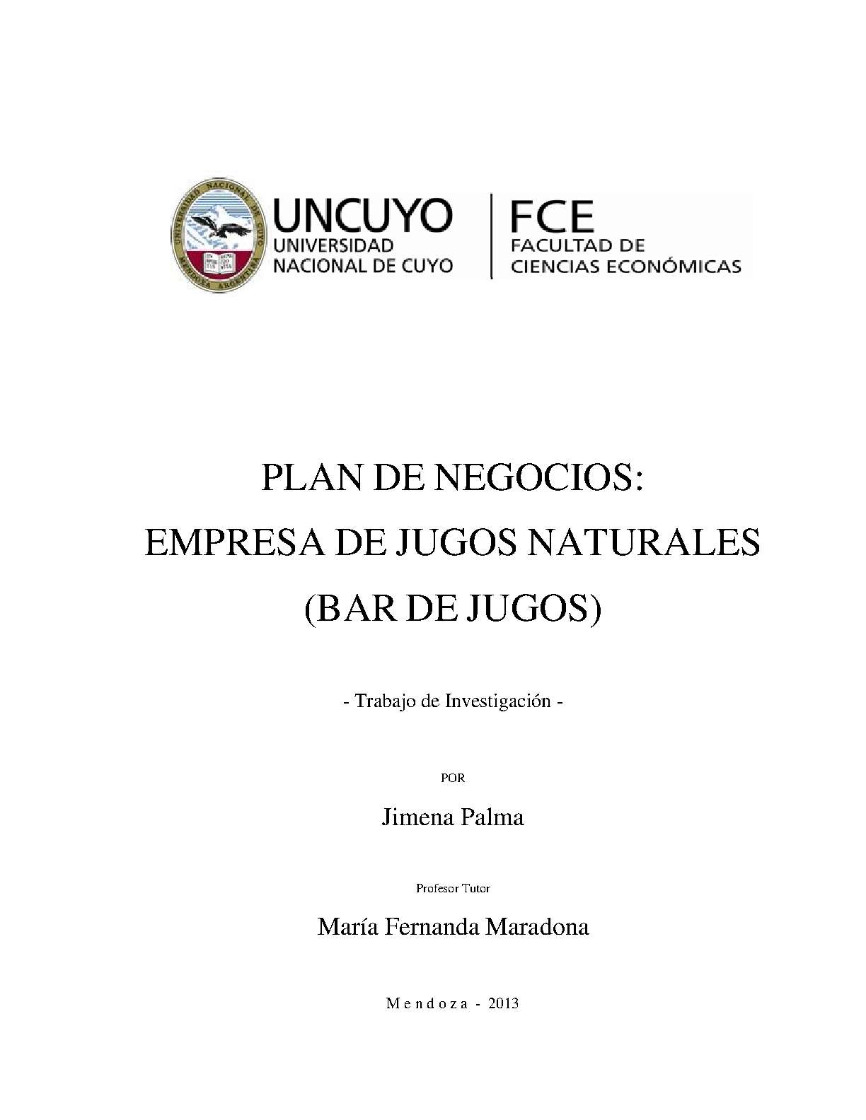 Palma, Jimena. (2013). Plan de negocios: empresa de jugos naturales (bar de jugos) (Trabajo final de grado). Mendoza, Universidad Nacional de Cuyo. Facultad de Ciencias Económicas.