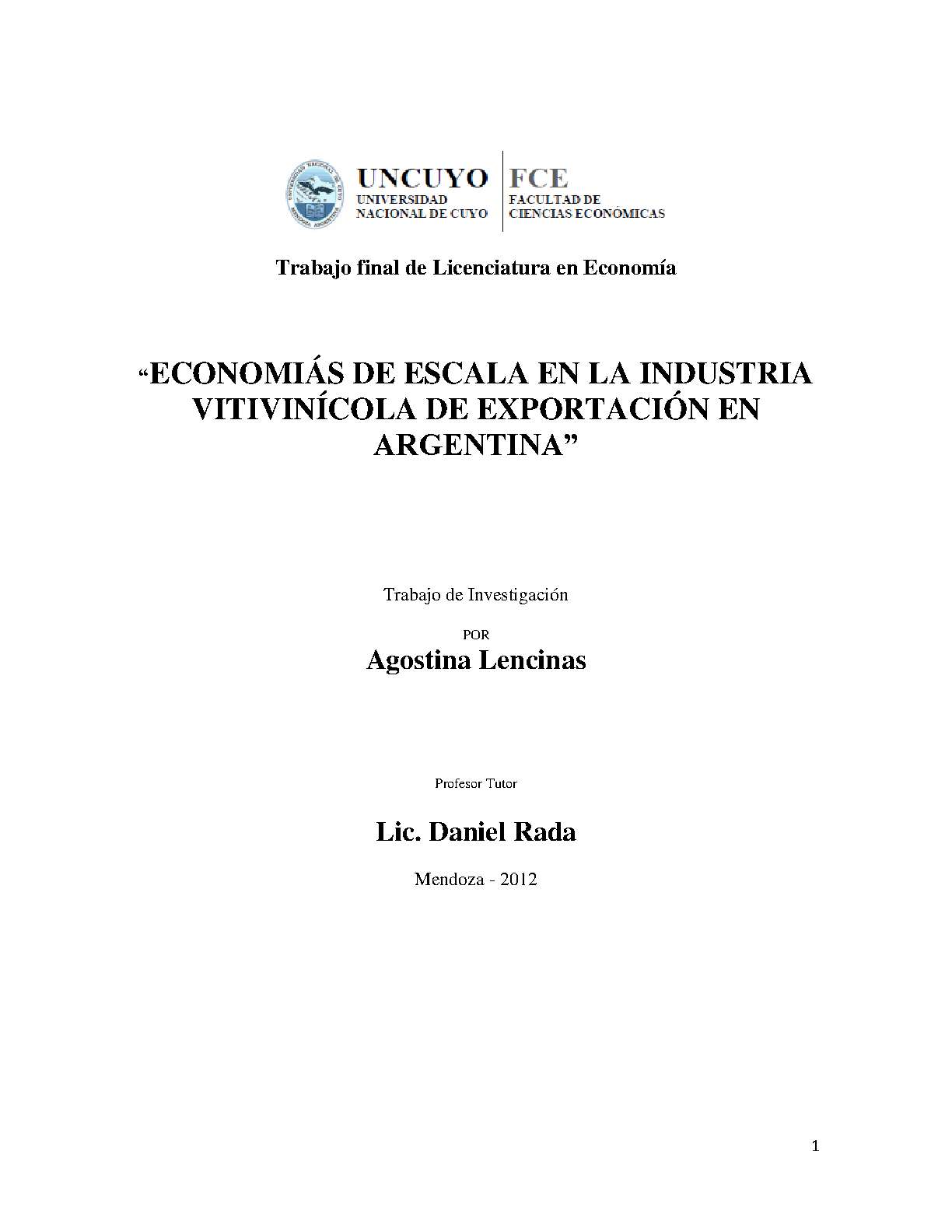Lencinas, Agostina. (2012). Economías de escala en la industria vitivinícola de exportación en Argentina: (Trabajo final de grado). Mendoza, Universidad Nacional de Cuyo. Facultad de Ciencias Económicas.