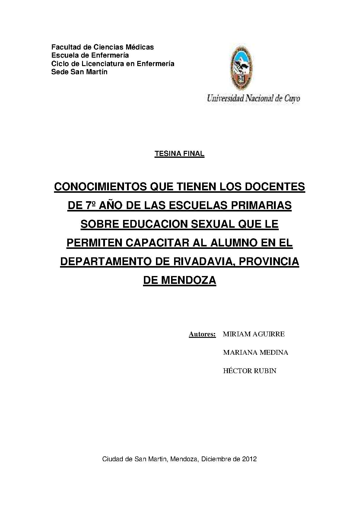 Aguirre, Miriam; Medina, Mariana; Rubin, Héctor. (2012). Conocimientos que tienen los docentes de 7º año de las escuelas primarias sobre educación sexual que le permiten capacitar al alumno en el departamento de Rivadavia, provincia de Mendoza: (Tesina de grado). Mendoza, Universidad Nacional de Cuyo. Facultad de Ciencias Médicas. Escuela de Enfermería..
