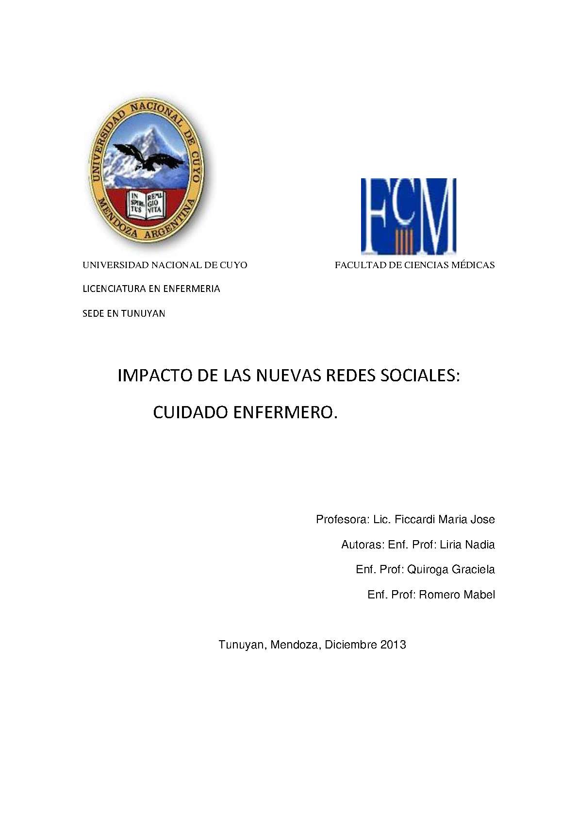 En el siguiente trabajo se encuentran las diferentes definiciones de redes sociales y el diferente uso que cada uno le da a las mismas; el cual nos motivó para realizar la siguiente investigación y determinar si dichas redes afectan directa o indirectamente en el comportamiento de los pacientes internados y sus familiares; con esta tarea queremos comprobar cuáles son los efectos que tienen las redes sociales sobre estos, y en consecuencia en los cuidados de enfermería.