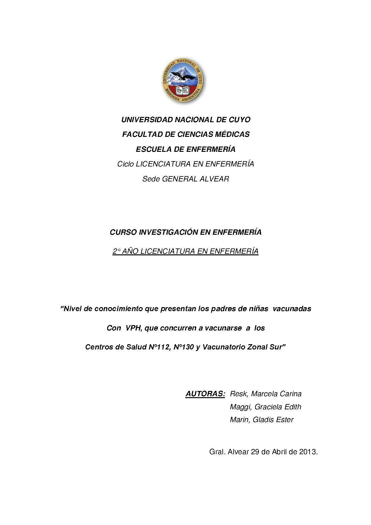El presente trabajo nace de la inquietud de indagar sobre conocimientos que poseen los padres de las niñas nacidas entre las cohortes 2000 a 2002, sobre la vacuna VPH y que asisten en forma espontánea a iniciar o completar esquemas con esta vacuna a los CSNº112 El Usillal, CSNº130 Salto de las Rosas y Vacunatorio Zonal Sur.