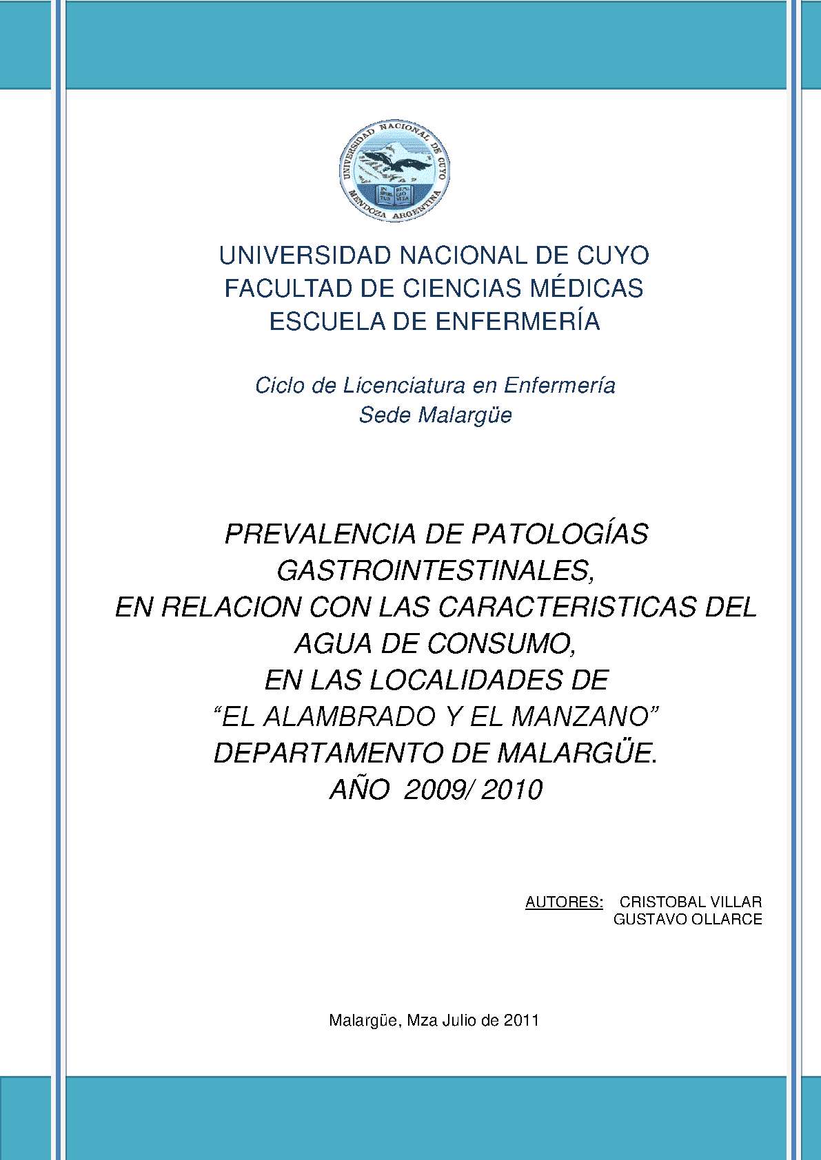 Prevalencia de patologías gastrointestinales, en relación con las características del agua de consumo, en las localidades de El Alambrado y El Manzano, departamento de Malargüe