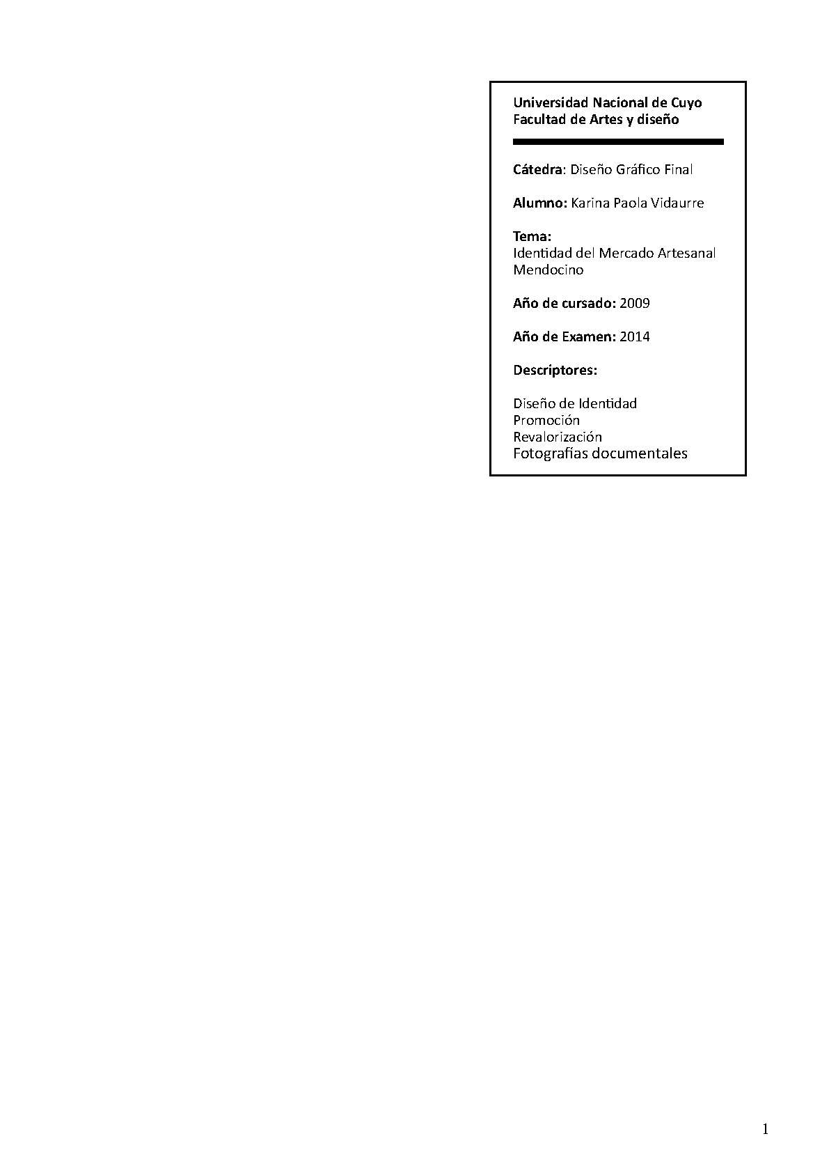 Vidaurre, Karina Paola. (2014). Identidad del Mercado Artesanal Mendocino: (Tesina de grado). Mendoza, Universidad Nacional de Cuyo. Facultad de Artes y Diseño .