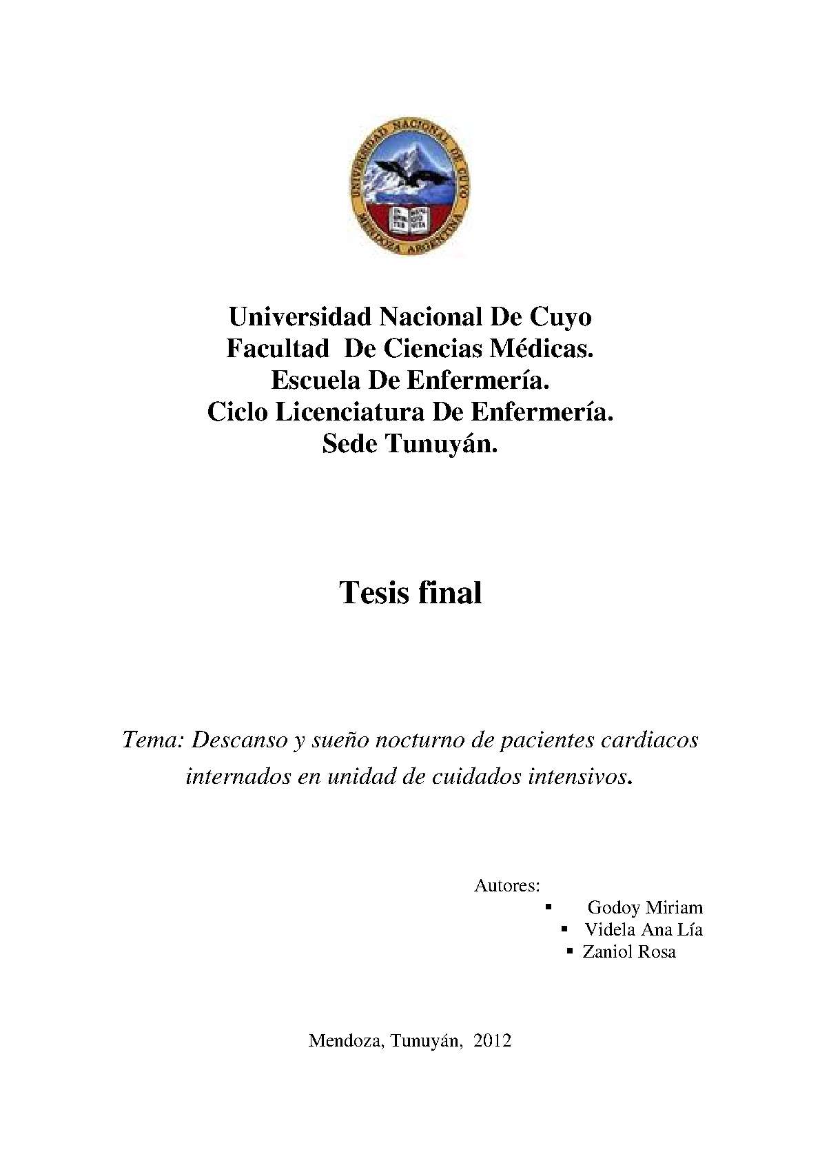 Godoy, Miriam; Videla, Ana Lía; Zaniol, Rosa. (2012). Descanso y sueño nocturno de pacientes cardíacos internados en unidad de cuidados intensivos : (Tesina de grado). Mendoza, Universidad Nacional de Cuyo. Facultad de Ciencias Médicas. Escuela de Enfermería..