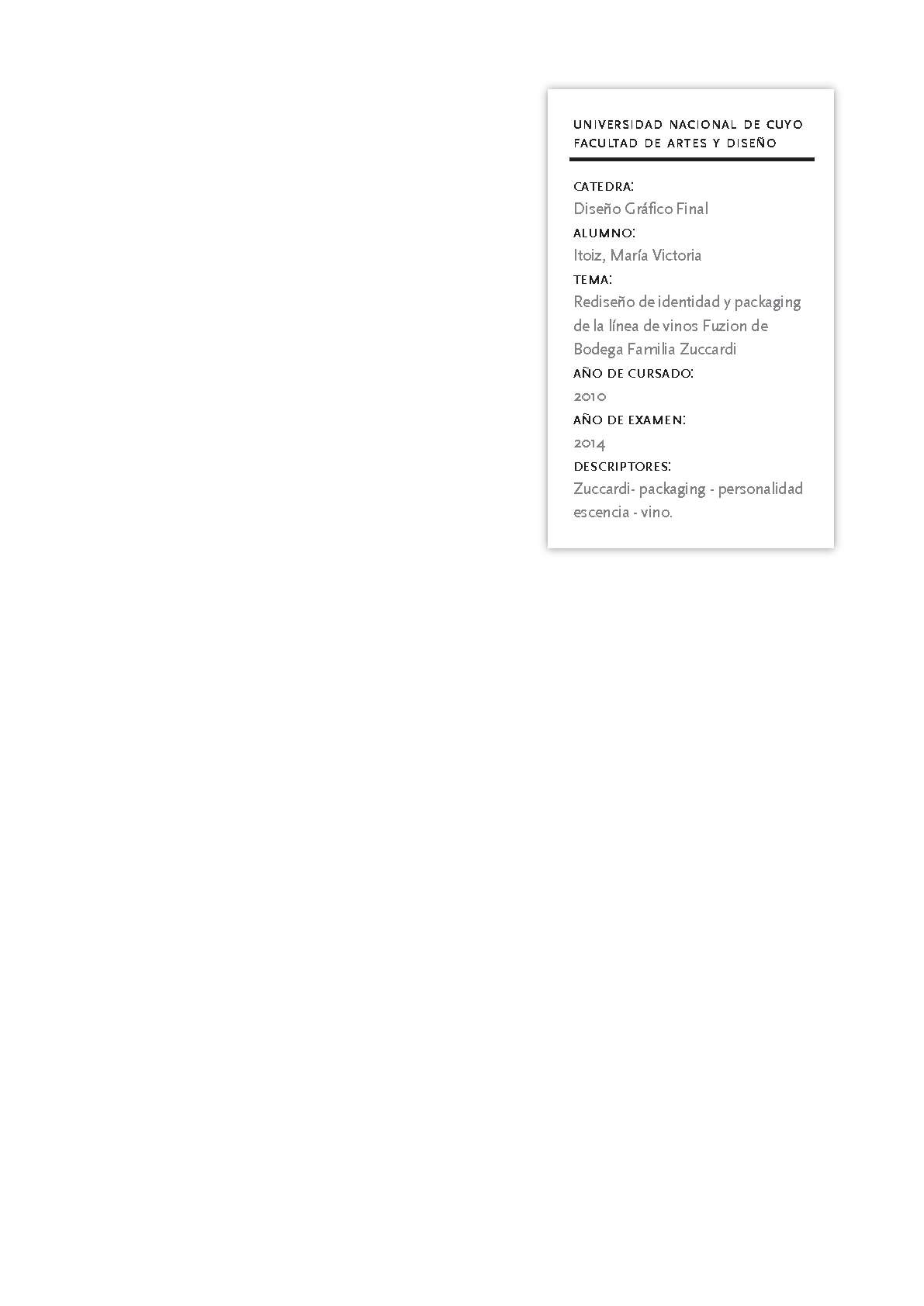 Itoiz, María Victoria. (2014). Rediseño de identidad y packaging de la línea de vinos Fuzion de Bodega Familia Zuccardi: (Trabajo final de grado). Mendoza, Universidad Nacional de Cuyo. Facultad de Artes y Diseño .