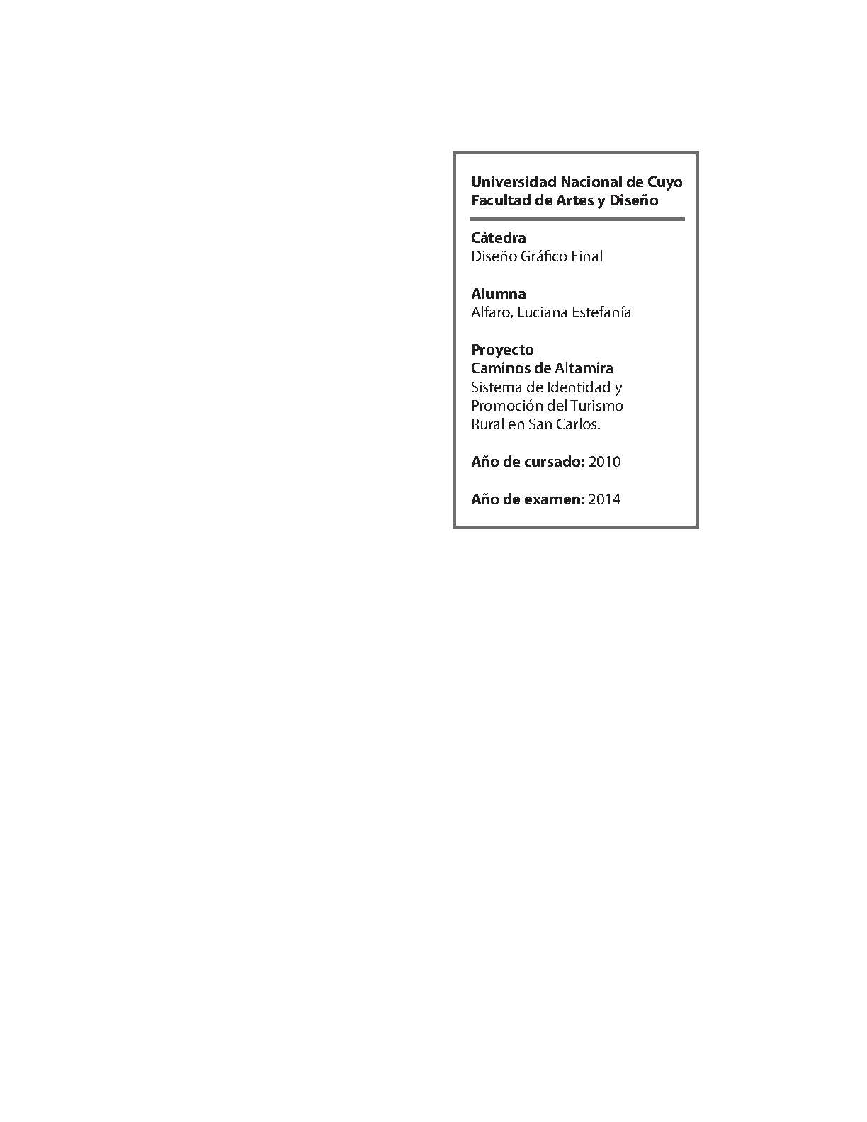 Alfaro, Luciana Estefanía. (2014). Caminos de Altamira : Sistema de identidad y promoción del turismo rural de San Carlos: (Tesina de grado). Mendoza, Universidad Nacional de Cuyo. Facultad de Artes y Diseño .