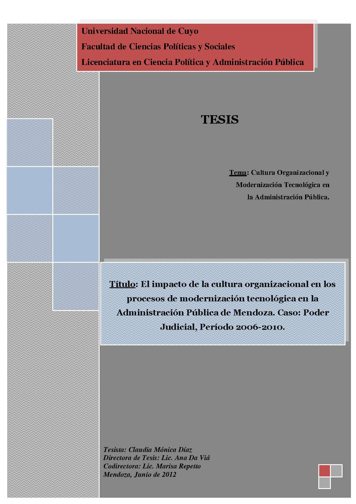 Díaz, Claudia Mónica. (2012). El impacto de la cultura organizacional en los procesos de modernización tecnológica en la Administración Pública de Mendoza: caso: Poder Judicial, período 2006-2010 (Tesina de grado). Mendoza, Universidad Nacional de Cuyo. Facultad de Ciencias Políticas y Sociales .